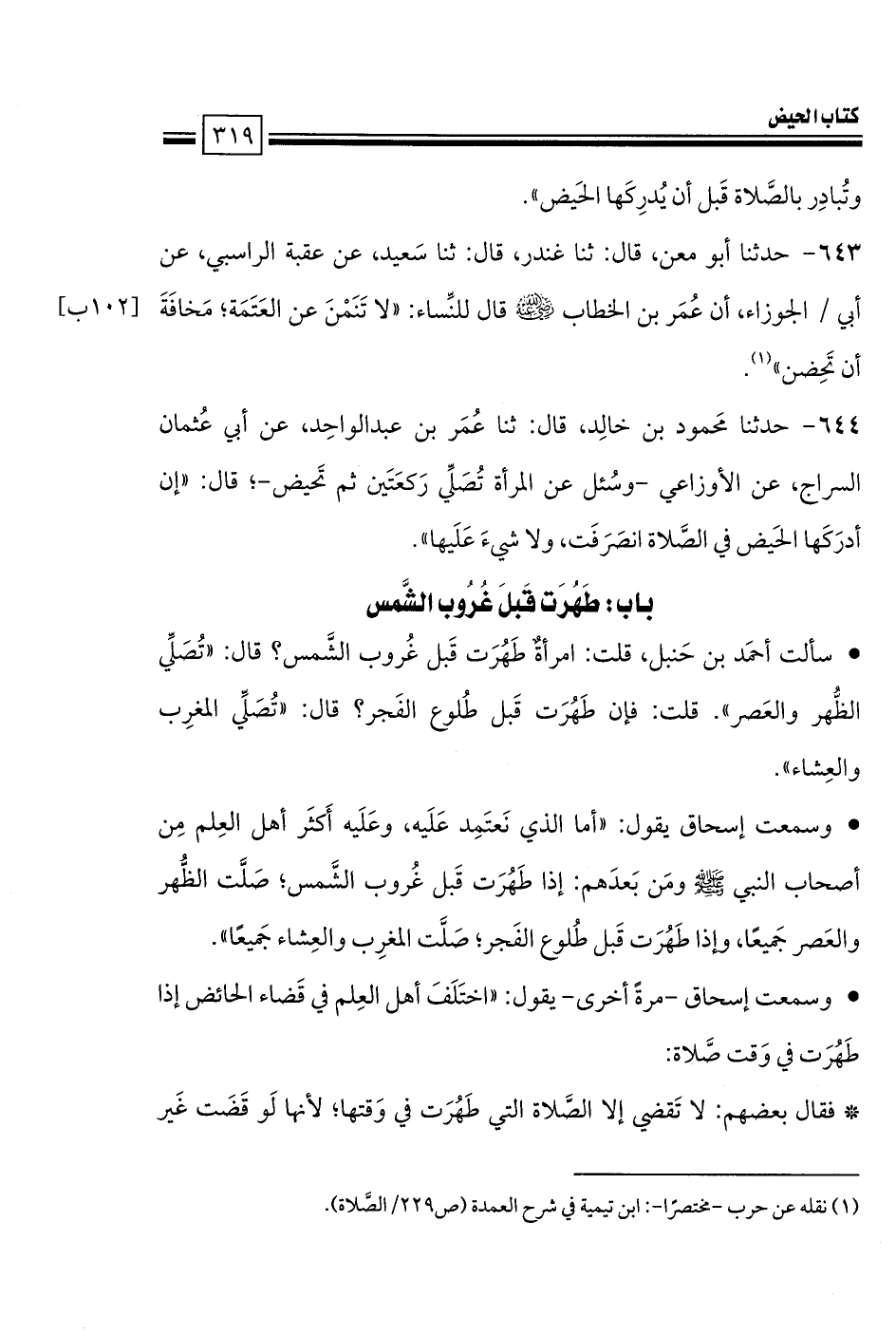 • سألت أحمَد بن حَنبل، قلت: امرأةٌ طَهُرَت قَبل غُروب الشَّمس؟ قال: «تُصَلِّي الظُّهر والعَصر». قلت: فإن طَهُرَت قَبل طُلوع الفَجر؟ قال: «تُصَلِّي المغرِب والعِشاء».