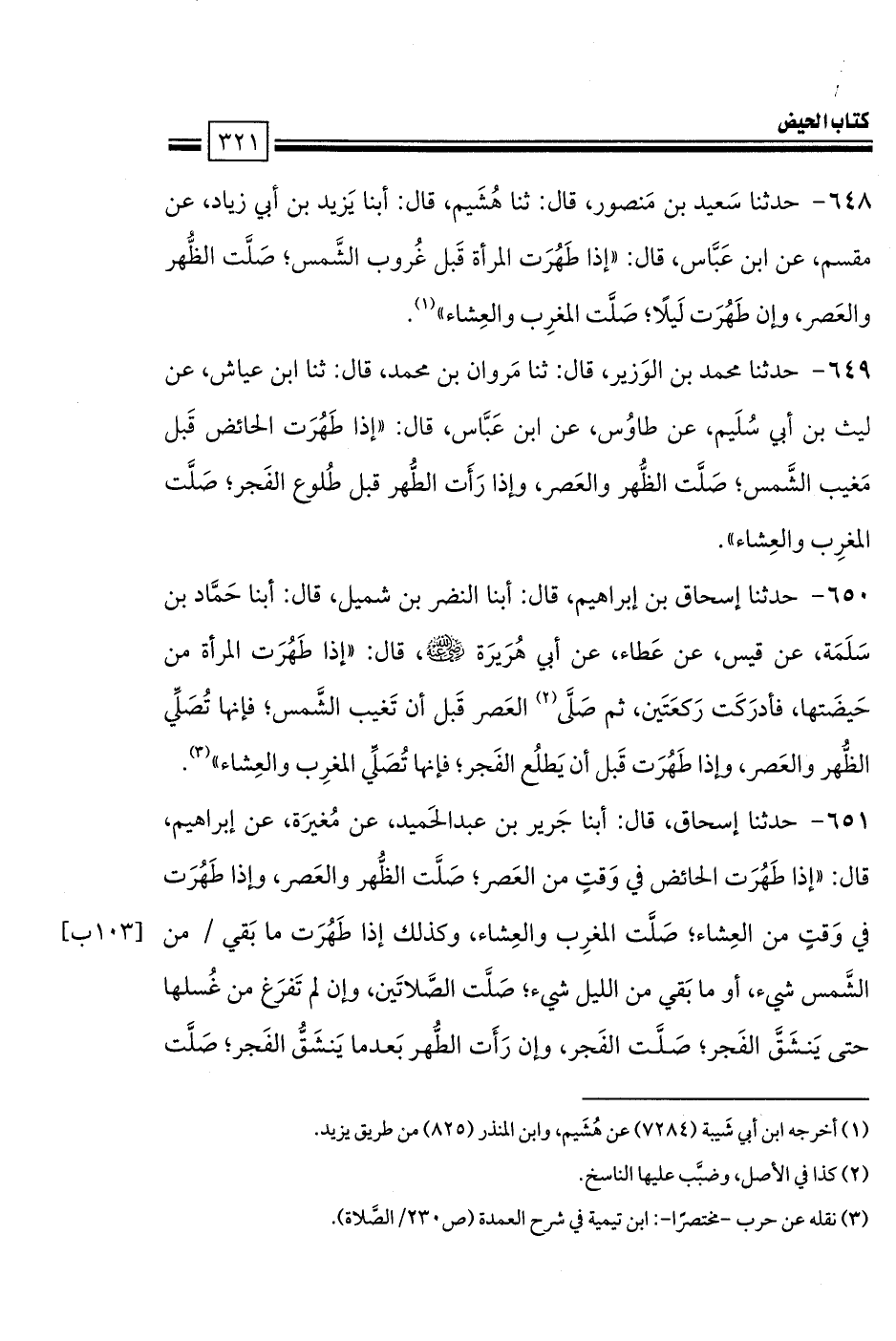 648 - حدثنا سَعيد بن مَنصور، قال: ثنا هُشَيم، قال: أبنا يَزيد بن أبي زياد، عن مقسم، عن ابن عَبَّاس، قال: «إذا طَهُرَت المرأة قَبل غُروب الشَّمس؛ صَلَّت الظُّهر والعَصر، وإن طَهُرَت لَيلًا؛ صَلَّت المغرِب والعِشاء».