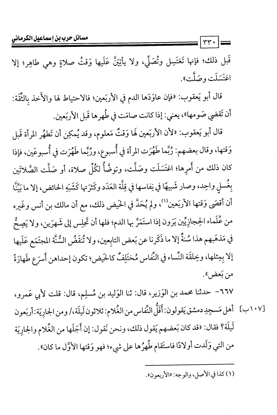 667 - حدثنا محمد بن الوَزير، قال: ثنا الوَليد بن مُسلِم، قال: قلت لأبي عَمرو، أهل مَسجِدِ دمشق يَقولون: أَقَلُّ النِّفاس من الغُلام: ثلاثون لَيلَة، ومن الجارِيَة: أربَعون لَيلَة؟ فقال: «قد كان بَعضهم يَقول ذلك، ونحن نَقول: إن أَجَلَها من الغُلام والجارِيَة من التي وَلَدت أولادًا فاستَقام طُهرُها على شيء؛ فهو وَقتها الأوَّل ما كان».