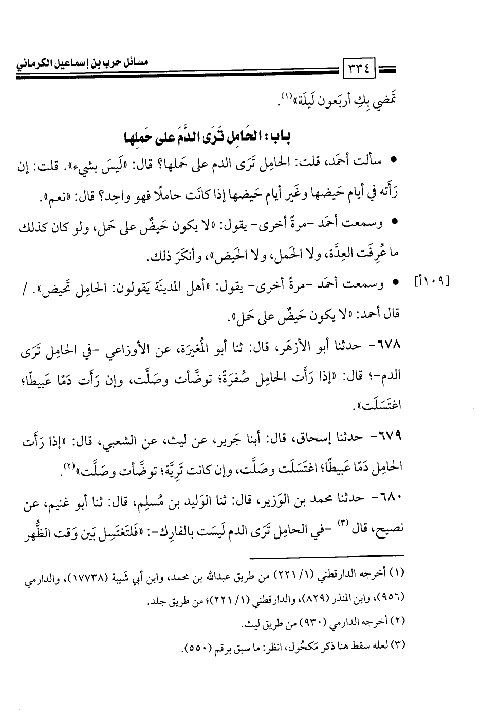 • سألت أحمَد، قلت: الحامِل تَرَى الدم على حَملها؟ قال: «لَيسَ بشيء». قلت: إن رَأَته في أيام حَيضها وغَير أيام حَيضها إذا كانَت حاملًا فهو واحِد؟ قال: «نعم».