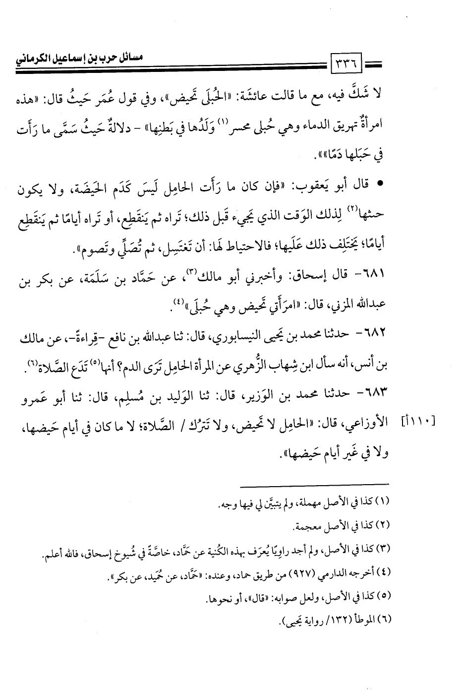 681 - قال إسحاق: وأخبرني أبو مالك، عن حَمَّاد بن سَلَمَة، عن بكر بن عبد الله المزني، قال: «امرَأَتي تَحيض وهي حُبلَى».