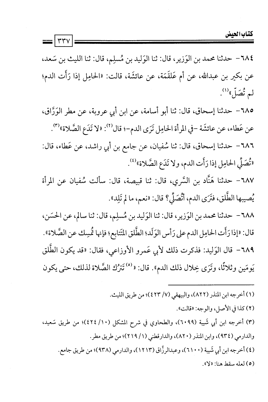 688 - حدثنا محمد بن الوَزير، قال: ثنا الوَليد بن مُسلِم، قال: ثنا سالم، عن الحسَن، قال: «إذا رَأَت الحامِل الدم على رَأس الوَلَد؛ الطَّلق المتَتابع؛ فإنها تُمسِك عن الصَّلاة».