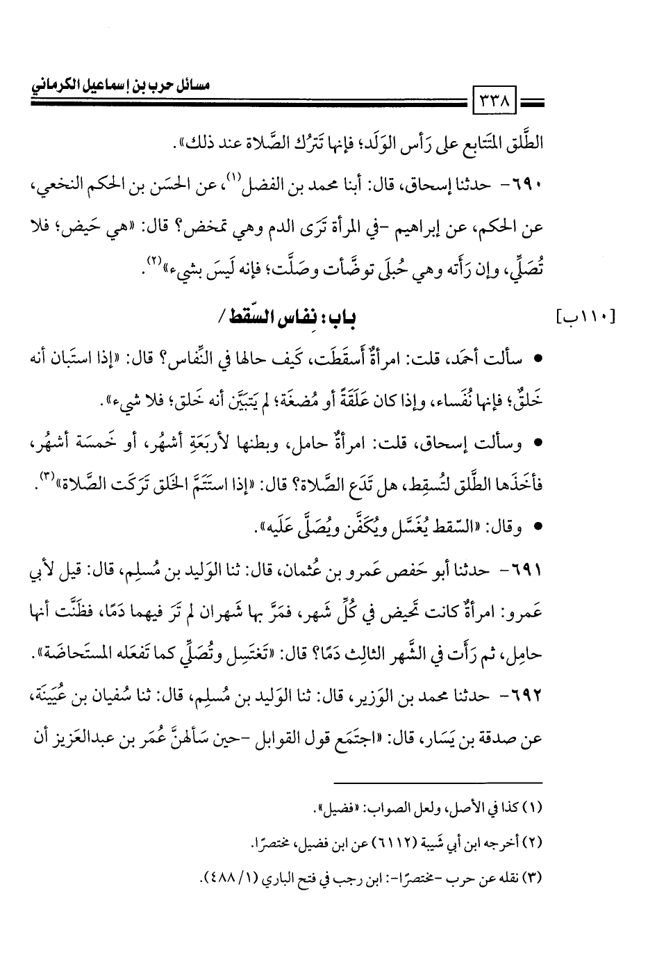 • سألت أحمَد، قلت: امرأةٌ أَسقَطَت، كَيف حالها في النِّفاس؟ قال: «إذا استَبان أنه خَلقٌ؛ فإنها نُفَساء، وإذا كان عَلَقَةً أو مُضغَة؛ لم يَتبَيَّن أنه خَلق؛ فلا شيء».