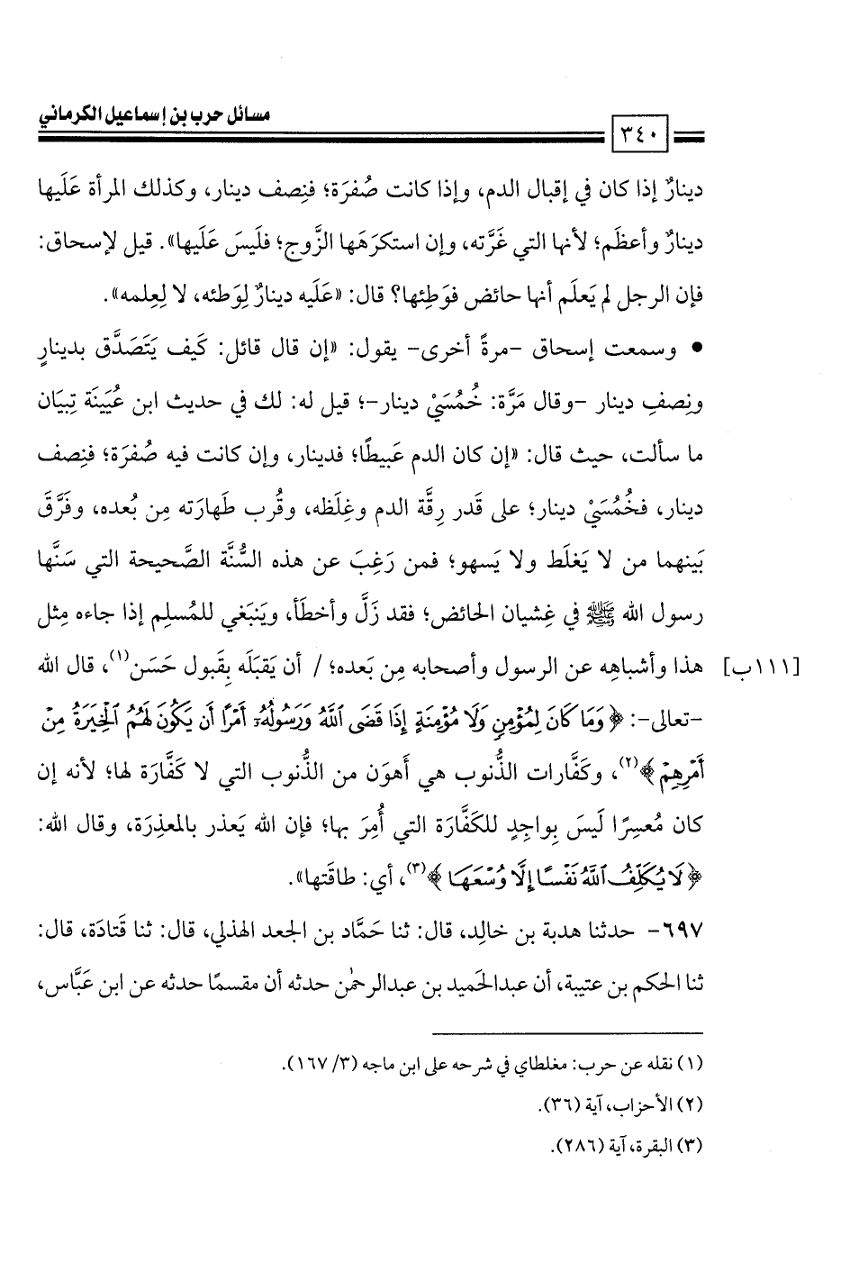 • وسمعت إسحاق -مرةً أخرى- يقول: «إن قال قائل: كَيف يَتَصَدَّق بدينارٍ ونِصفِ دينار -وقال مَرَّة: خُمُسَيْ دينار-؛ قيل له: لك في حديث ابن عُيَينَة تِبيَان ما سألت، حيث قال: «إن كان الدم عَبيطًا؛ فدينار، وإن كانت فيه صُفرَة؛ فنِصف دينار، فخُمُسَيْ دينار؛ على قَدر رِقَّة الدم وغِلَظه، وقُرب طَهارَته مِن بُعده، وفَرَّقَ بَينهما من لا يَغلَط ولا يَسهو؛ فمن رَغِبَ عن هذه السُّنَّة الصَّحيحة التي سَنَّها رسول الله صلى الله عليه وسلم في غِشيان الحائض؛ فقد زَلَّ وأخطَأ، ويَنبَغي للمُسلِم إذا جاءه مِثل هذا وأشباهِه عن الرسول وأصحابه مِن بَعده؛ أن يَقبَلَه بِقَبول حَسَن، قال الله -تعالى-: {وما كان لمؤمن ولا مؤمنة إذا قضى الله ورسوله أمرًا أن يكون لهم الخيرة من أمرهم}، وكَفَّارات الذُّنوب هي أَهوَن من الذُّنوب التي لا كَفَّارَة لها؛ لأنه إن كان مُعسِرًا لَيسَ بِواجِدٍ للكَفَّارَة التي أُمِرَ بها؛ فإن الله يَعذر بالمعذِرَة، وقال الله: {لا يكلف الله نفسًا إلا وسعها}، أي: طاقَتها».