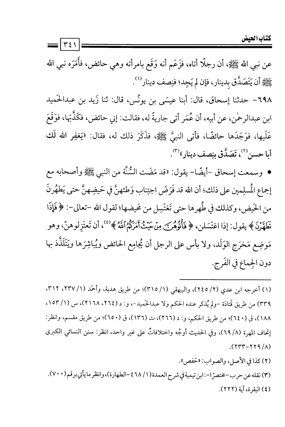 698 - حدثنا إسحاق، قال: أبنا عيسَى بن يونُس، قال: ثنا زَيد بن عبد الحَميد بن عبد الرحمن، عن أبيه، أن عُمَر أتى جاريةً له، فقالت: إني حائض، فكَذَّبَها، فوَقَعَ عَلَيها، فوَجَدَها حائضًا، فأتى النبيَّ صلى الله عليه وسلم، فذَكَرَ ذلك له، فقال: «يَغفِر الله لَك أبا حسن (1)، تَصَدَّق بنِصف دينار».
