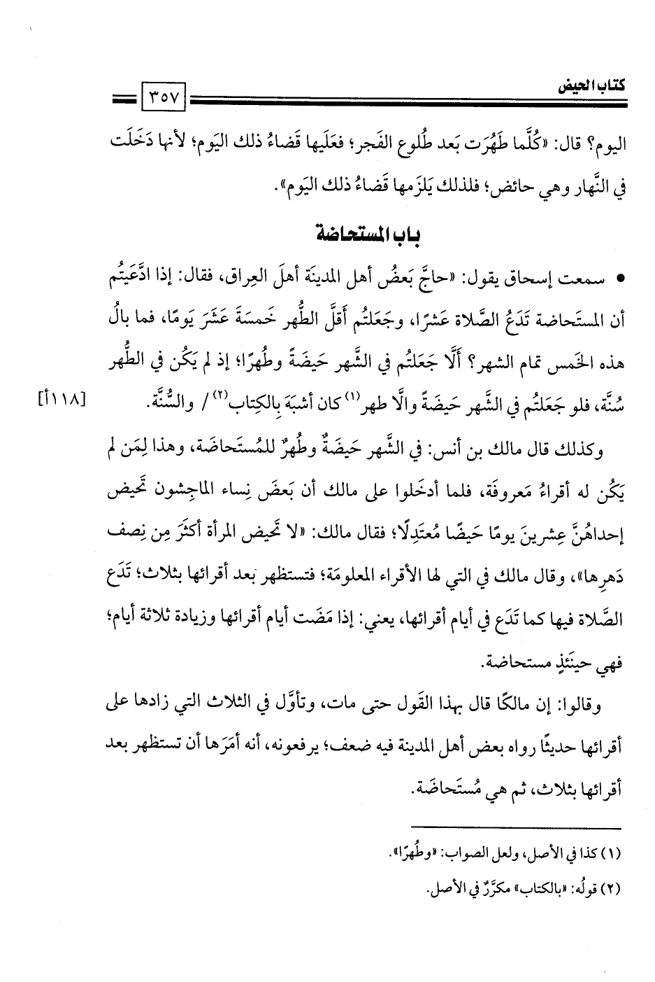 • سمعت إسحاق يقول: «حاجَّ بَعضُ أهل المدينَة أهلَ العِراق، فقال: إذا ادَّعَيتُم أن المستَحاضة تَدَعُ الصَّلاة عَشرًا، وجَعَلتُم أَقلَّ الطُّهر خَمسَةَ عَشَرَ يَومًا، فما بالُ هذه الخَمس تمام الشهر؟ أَلَّا جَعَلتُم في الشَّهر حَيضَةً وطُهرًا؛ إذ لم يَكُن في الطُّهر سُنَّة، فلو جَعَلتُم في الشَّهر حَيضَةً والَّا طهر (1) كان أشبَهَ بِالكِتاب والسُّنَّة.