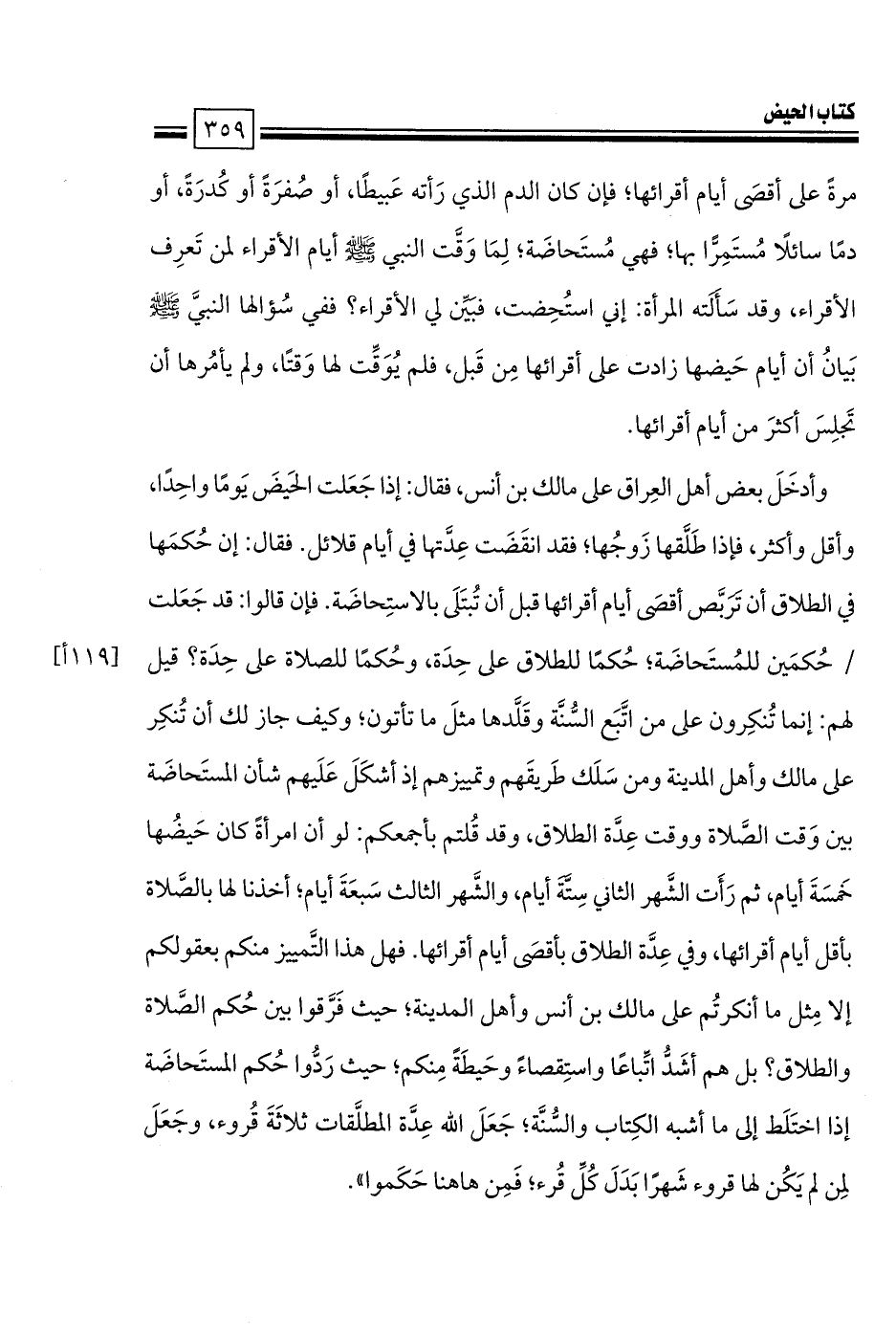 وأدخَلَ بعض أهل العِراق على مالك بن أنس، فقال: إذا جَعَلت الحَيضَ يَومًا واحِدًا، وأقل وأكثر، فإذا طَلَّقها زَوجُها؛ فقد انقَضَت عِدَّتها في أيام قلائل. فقال: إن حُكمَها في الطلاق أن تَرَبَّص أقصَى أيام أقرائها قبل أن تُبتَلَى بالاستِحاضَة. فإن قالوا: قد جَعَلت حُكمَين للمُستَحاضَة؛ حُكمًا للطلاق على حِدَة، وحُكمًا للصلاة على حِدَة؟ قيل لهم: إنما تُنكِرون على من اتَّبَع السُّنَّة وقَلَّدها مثلَ ما تأتون؛ وكيف جاز لك أن تُنكِر على مالك وأهل المدينة ومن سَلَك طَريقَهم وتمييزهم إذ أشكَلَ عَلَيهم شأن المستَحاضَة بين وَقت الصَّلاة ووقت عِدَّة الطلاق، وقد قُلتم بأجمعكم: لو أن امرأةً كان حَيضُها خَمسَةَ أيام، ثم رَأَت الشَّهر الثاني سِتَّةَ أيام، والشَّهر الثالث سَبعَةَ أيام؛ أخذنا لها بالصَّلاة بأقل أيام أقرائها، وفي عِدَّة الطلاق بأقصَى أيام أقرائها. فهل هذا التَّمييز منكم بعقولكم إلا مِثل ما أنكرتُم على مالك بن أنس وأهل المدينة؛ حيث فَرَّقوا بين حُكم الصَّلاة والطلاق؟ بل هم أشَدُّ اتِّباعًا واستِقصاءً وحَيطَةً مِنكم؛ حيث رَدُّوا حُكم المستَحاضَة إذا اختَلَط إلى ما أشبه الكِتاب والسُّنَّة؛ جَعَلَ الله عِدَّة المطلَّقات ثلاثَةَ قُروء، وجَعَلَ لِمن لم يَكُن لها قروء شَهرًا بَدَلَ كُلِّ قُرء؛ فَمِن هاهنا حَكَموا».