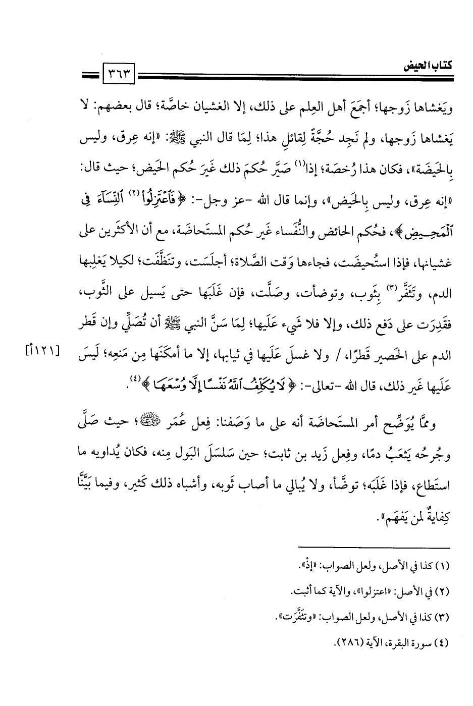 وممَّا يُوَضِّح أمر المستَحاضَة أنه على ما وَصَفنا: فِعل عُمَر -رضي الله عنه-؛ حيث صَلَّى وجُرحُه يَثعَبُ دمًا، وفِعل زَيد بن ثابت؛ حين سَلسَلَ البَول مِنه، فكان يُداويه ما استَطاع، فإذا غَلَبَه؛ توضَّأ، ولا يُبالي ما أصاب ثَوبه، وأشباه ذلك كَثير، وفيما بَيَّنَّا كِفايةٌ لمن يَفهَم».