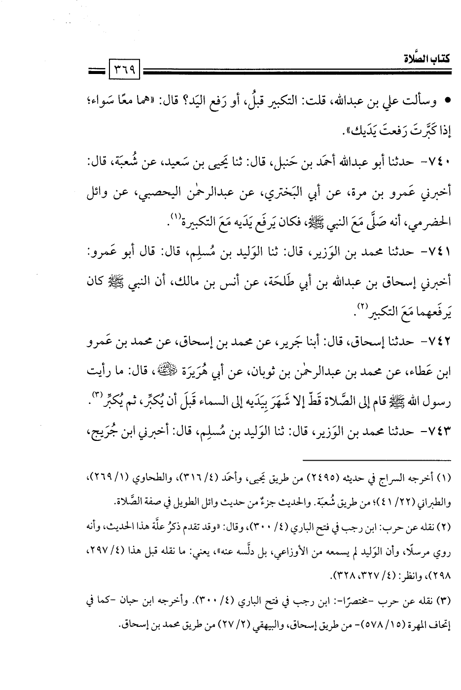 740 - حدثنا أبو عبد الله أحمَد بن حَنبل، قال: ثنا يَحيى بن سَعيد، عن شُعبَة، قال: أخبرني عَمرو بن مرة، عن أبي البَختري، عن عبد الرحمن اليحصبي، عن وائل الحضرمي، أنه صَلَّى مَعَ النبي صلى الله عليه وسلم، فكان يَرفَع يَدَيه مَعَ التكبيرة.