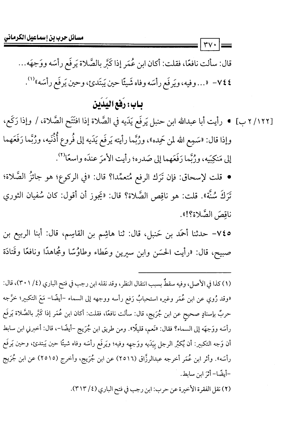 745 - حدثنا أحمَد بن حَنبل، قال: ثنا هاشِم بن القاسِم، قال: أبنا الربيع بن صبيح، قال: «رأيت الحسَن وابن سيرين وعَطاء وطاوُسًا ومُجاهدًا ونافعًا وقَتادَة -[371]- وابن أبي نجيح والحسَن بن مُسلِم؛ إذا دَخَلوا في الصَّلاة كَبَّروا ورَفَعوا أيديهم، وإذا كَبَّروا للركوع رَفَعوا أيديهم، غيرَ أن أهل الحجاز كانوا يَرفَعون أيديهم إذا قاموا من الركعتين من الفَريضة، وكانوا يقعون على أعقابهم».