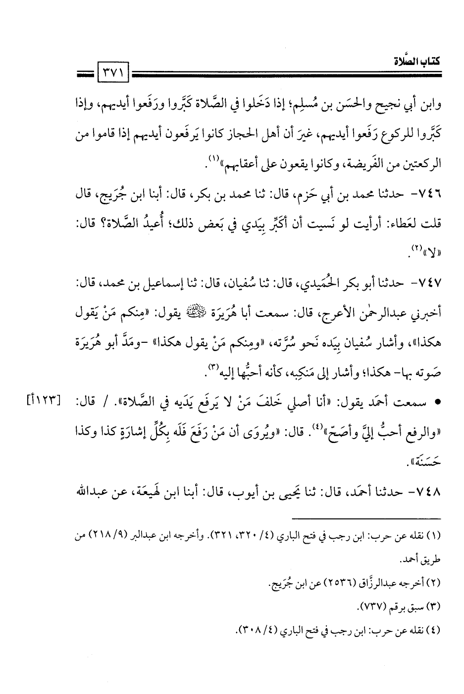 • سمعت أحمَد يقول: «أنا أصلي خَلفَ مَنْ لا يَرفَع يَدَيه في الصَّلاة». قال: «والرفع أحبُّ إليَّ وأصَحّ». قال: «ويُروَى أن مَنْ رَفَعَ فَلَه بِكُلِّ إشارَةٍ كذا وكذا حَسَنَة».