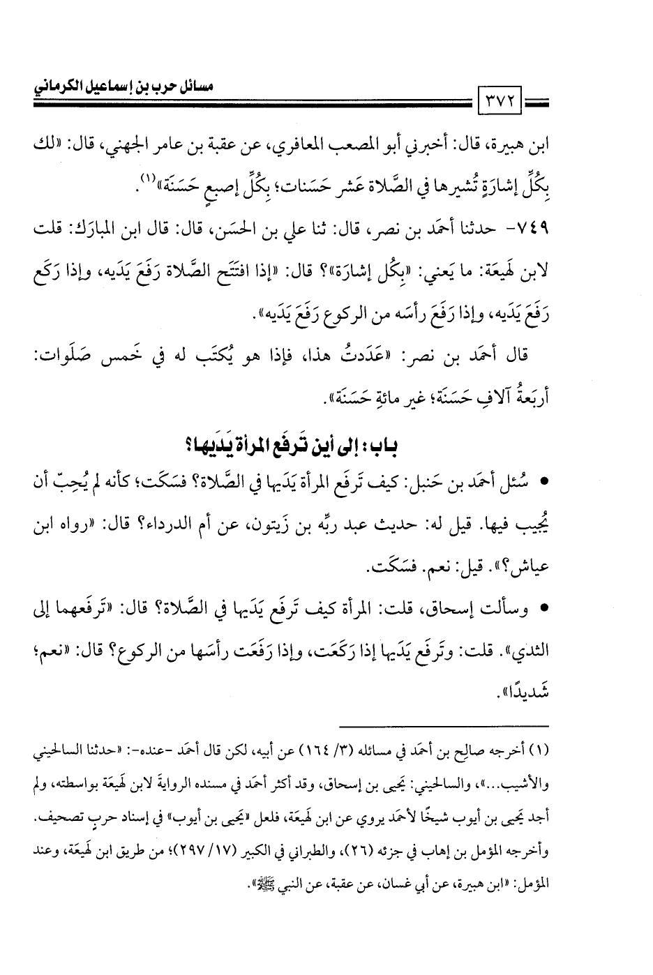 • وسألت إسحاق، قلت: المرأة كيف تَرفَع يَدَيها في الصَّلاة؟ قال: «تَرفَعهما إلى الثدي». قلت: وتَرفَع يَدَيها إذا رَكَعَت، وإذا رَفَعَت رأسَها من الركوع؟ قال: «نعم؛ شَديدًا».