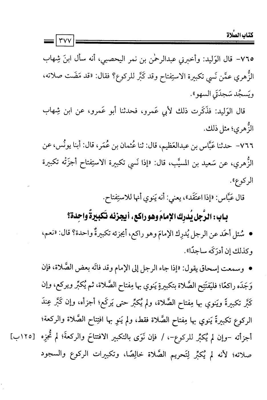 • سُئل أحمَد عن الرجل يُدرِك الإمامَ وهو راكع، أيجزئه تكبيرةٌ واحدة؟ قال: «نعم، وكذلك إن أدرَكَه ساجدًا».