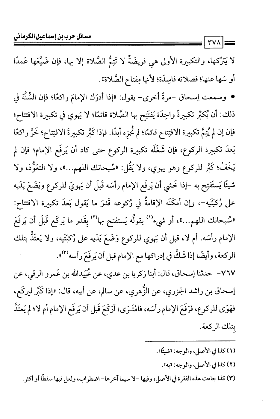 • وسمعت إسحاق -مرةً أخرى- يقول: «إذا أدرَك الإمامَ راكعًا؛ فإن السُّنَّة في ذلك: أن يُكبِّر تكبيرةً واحِدَة يَفتَتِح بها الصَّلاة قائمًا؛ لا يَهوي في تكبيرة الافتتاح؛ فإن إن لم يُتِمَّ تكبيرة الافتِتاح قائمًا؛ لم تُجزِه أبدًا. فإذا كَبَّر تكبيرةَ الافتِتاح؛ خَرَّ راكعًا بَعدَ تكبيرة الركوع، فإن شَغَلَه تكبيرة الركوع حتى كاد أن يَرفَع الإمام؛ فإن لم يَخَفْ؛ كَبَّر للركوع وهو يهوي، ولا يَقُل: «سُبحانك اللهم ...»، ولا التعَوُّذ، ولا شيئًا يَستَفتِح به -إذا خَشي أن يَرفَع الإمام رأسَه قَبلَ أن يَهويَ للركوع ويَضَعَ يَدَيه على رُكبَتَيه-، وإن أمكَنَه الإقامةُ في رُكوعه قَدرَ ما يَقول بَعدَ تكبيرة الافتتاح: «سُبحانك اللهم ...»، أو شيء (1) يقولُه يَستفتح بها (2) بِقَدر ما يَركَع قَبلَ أن يَرفَعَ الإمام رأسَه. أم لا، قبل أن يَهوي للركوع وَضَعَ يَدَيه على رُكبَتَيه، ولا يَعتَدُّ بتلك الركعة، وأيضًا إذا شَكَّ في إدراكها مع الإمام قبل أن يَرفَعَ رأسه (3)».