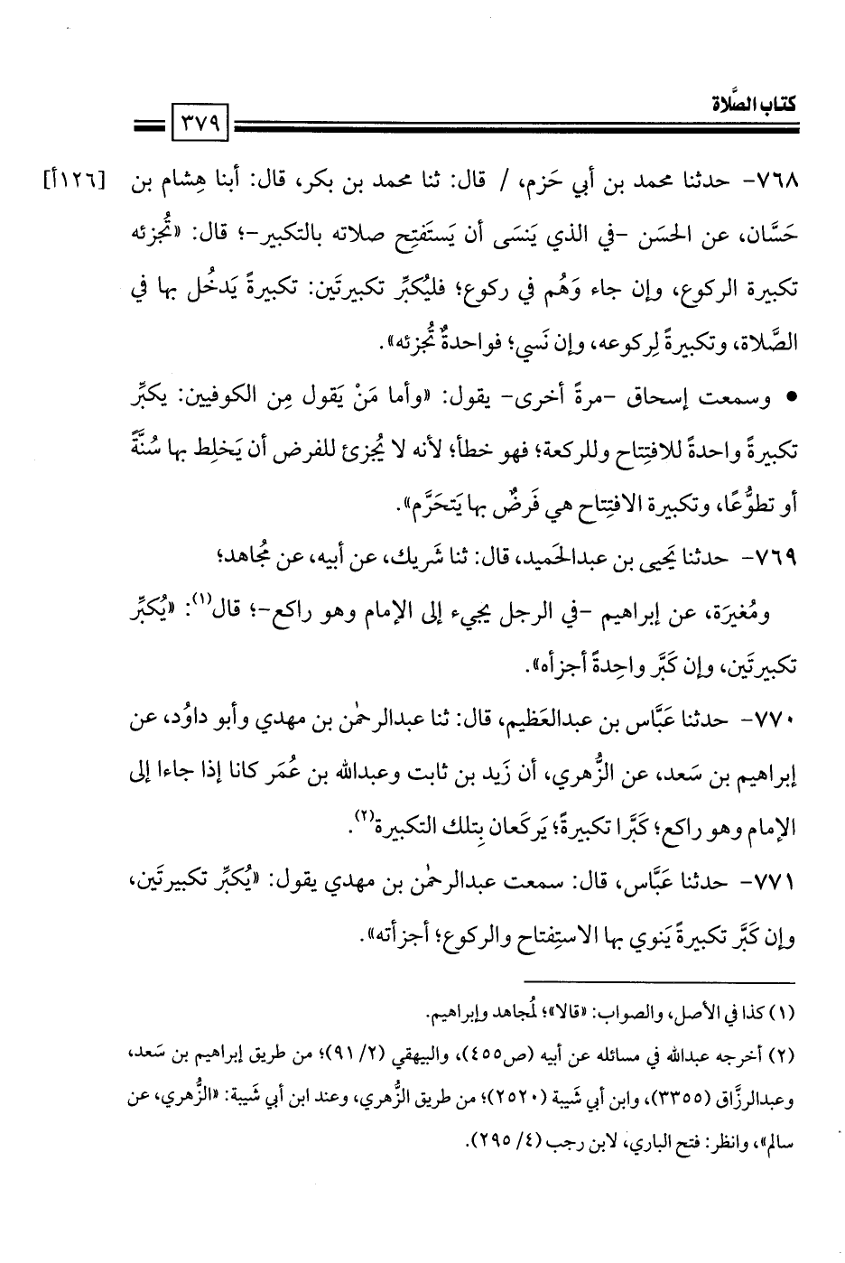 770 - حدثنا عَبَّاس بن عبد العَظيم، قال: ثنا عبد الرحمن بن مهدي وأبو داوُد، عن إبراهيم بن سَعد، عن الزُّهري، أن زَيد بن ثابت وعبد الله بن عُمَر كانا إذا جاءا إلى الإمام وهو راكع؛ كَبَّرا تكبيرةً؛ يَركَعان بِتلك التكبيرة.