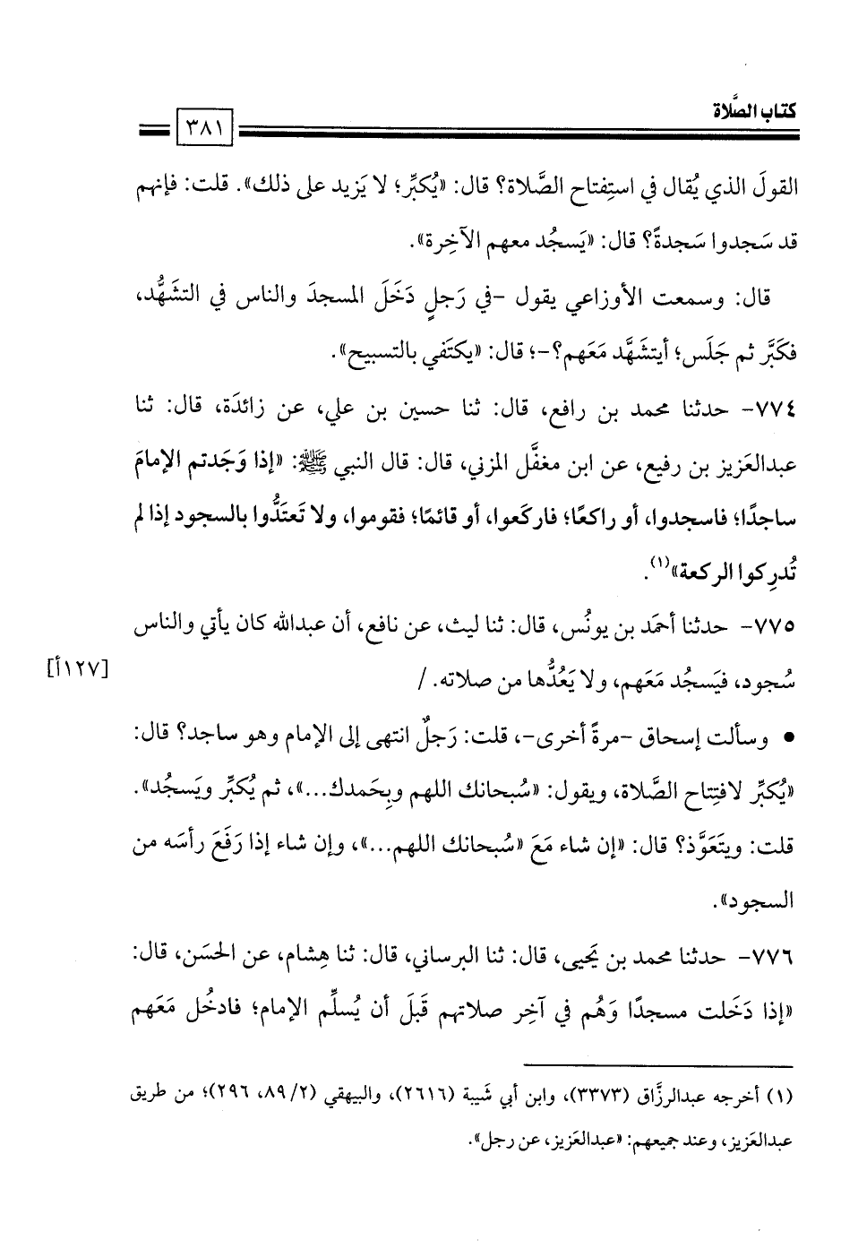 774 - حدثنا محمد بن رافع، قال: ثنا حسين بن علي، عن زائدَة، قال: ثنا عبد العَزيز بن رفيع، عن ابن مغفَّل المزني، قال: قال النبي صلى الله عليه وسلم: «إذا وَجَدتم الإمامَ ساجدًا؛ فاسجدوا، أو راكعًا؛ فاركَعوا، أو قائمًا؛ فقوموا، ولا تَعتَدُّوا بالسجود إذا لم تُدرِكوا الركعة».