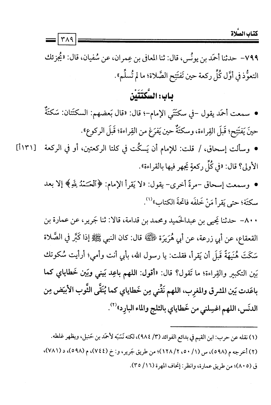 • سمعت أحمَد يقول -في سكتَتَي الإمام-؛ قال: «قال بَعضهم: السكتَتان: سَكتَةٌ حينَ يَفتَتِح؛ قَبلَ القِراءة، وسكتَةٌ حين يَفرَغ من القِراءة؛ قَبلَ الركوع».