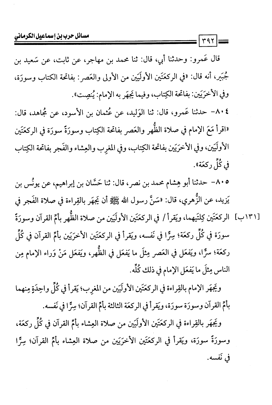 805 - حدثنا أبو هِشام محمد بن نصر، قال: ثنا حَسَّان بن إبراهيم، عن يونُس بن يَزيد، عن الزُّهري، قال: «سَنَّ رسول الله صلى الله عليه وسلم أن يَجهَر بالقِراءة في صلاة الفَجر في الركعَتَين كِلتَيهما، ويَقرأ في الركعَتَين الأولَيَين من صلاة الظُّهر بأمِّ القرآن وسورَةً سورَة في كُلِّ ركعَة؛ سِرًّا في نَفسه، ويَقرأ في الركعَتَين الأخرَيَين بأمِّ القرآن في كُلِّ ركعَة؛ سرًّا، ويَفعَل في العَصر مِثلَ ما يَفعَل في الظُّهر، ويَفعَل مَنْ وَراء الإمام مِن الناس مِثلَ ما يَفعَل الإمام في ذلك كُلِّه.