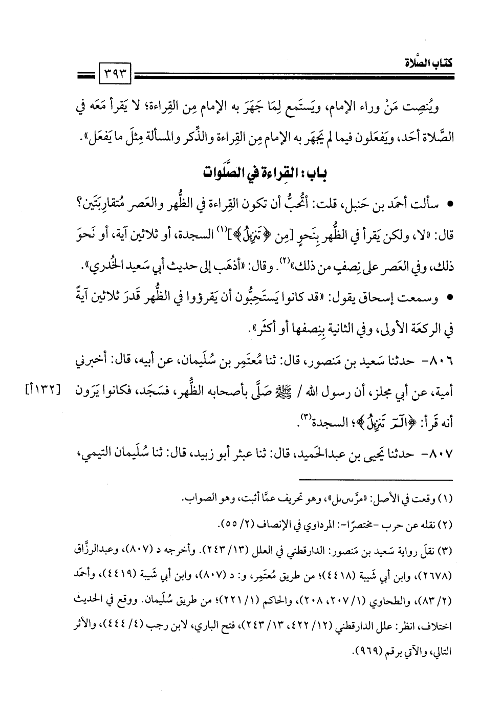 • سألت أحمَد بن حَنبل، قلت: أتُحبُّ أن تكون القِراءة في الظُّهر والعَصر مُتقارِبَتَين؟ قال: «لا، ولكن يَقرأ في الظُّهر بِنَحوٍ [مِن {تنزيل}] السجدة، أو ثلاثين آية، أو نَحوَ ذلك، وفي العَصر على نِصفٍ من ذلك». وقال: «أذهَب إلى حديث أبي سَعيد الخُدري».