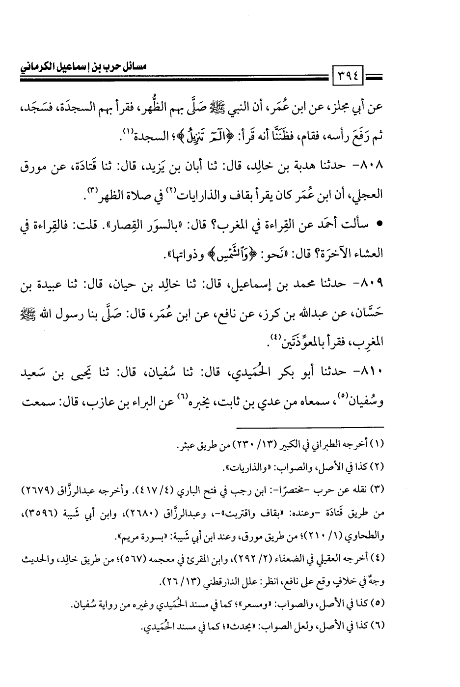 809 - حدثنا محمد بن إسماعيل، قال: ثنا خالِد بن حيان، قال: ثنا عبيدة بن حَسَّان، عن عبد الله بن كرز، عن نافع، عن ابن عُمَر، قال: صَلَّى بنا رسول الله صلى الله عليه وسلم المغرِب، فقرأ بالمعوِّذَتَين.