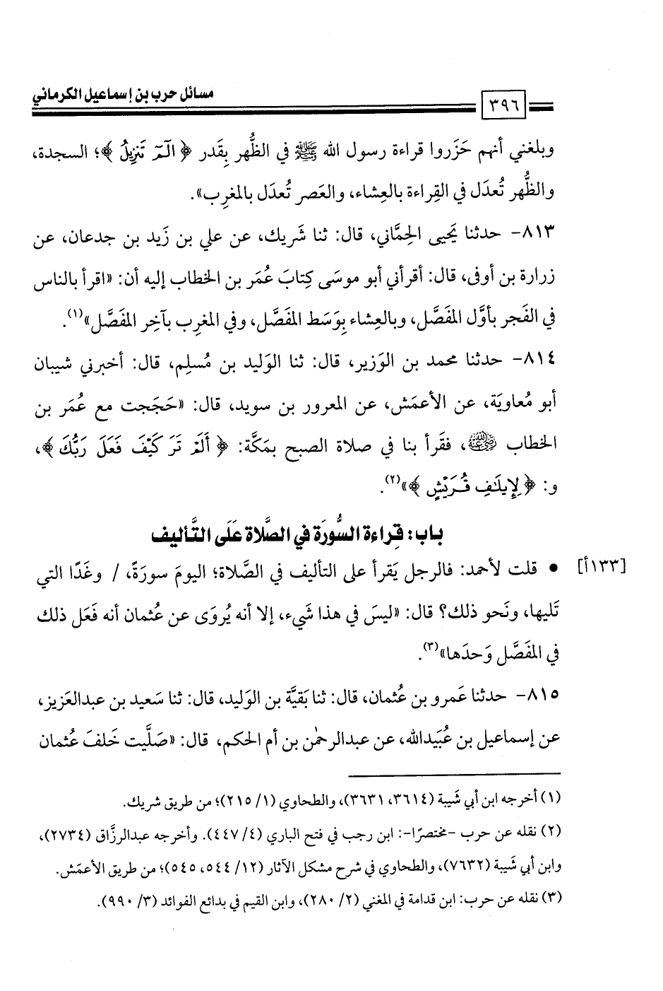 • قلت لأحمد: فالرجل يَقرأ على التأليف في الصَّلاة؛ اليومَ سورَةً، وغَدًا التي تَليها، ونَحو ذلك؟ قال: «ليسَ في هذا شَيء، إلا أنه يُروَى عن عُثمان أنه فَعَل ذلك في المفَصَّل وَحدَها».
