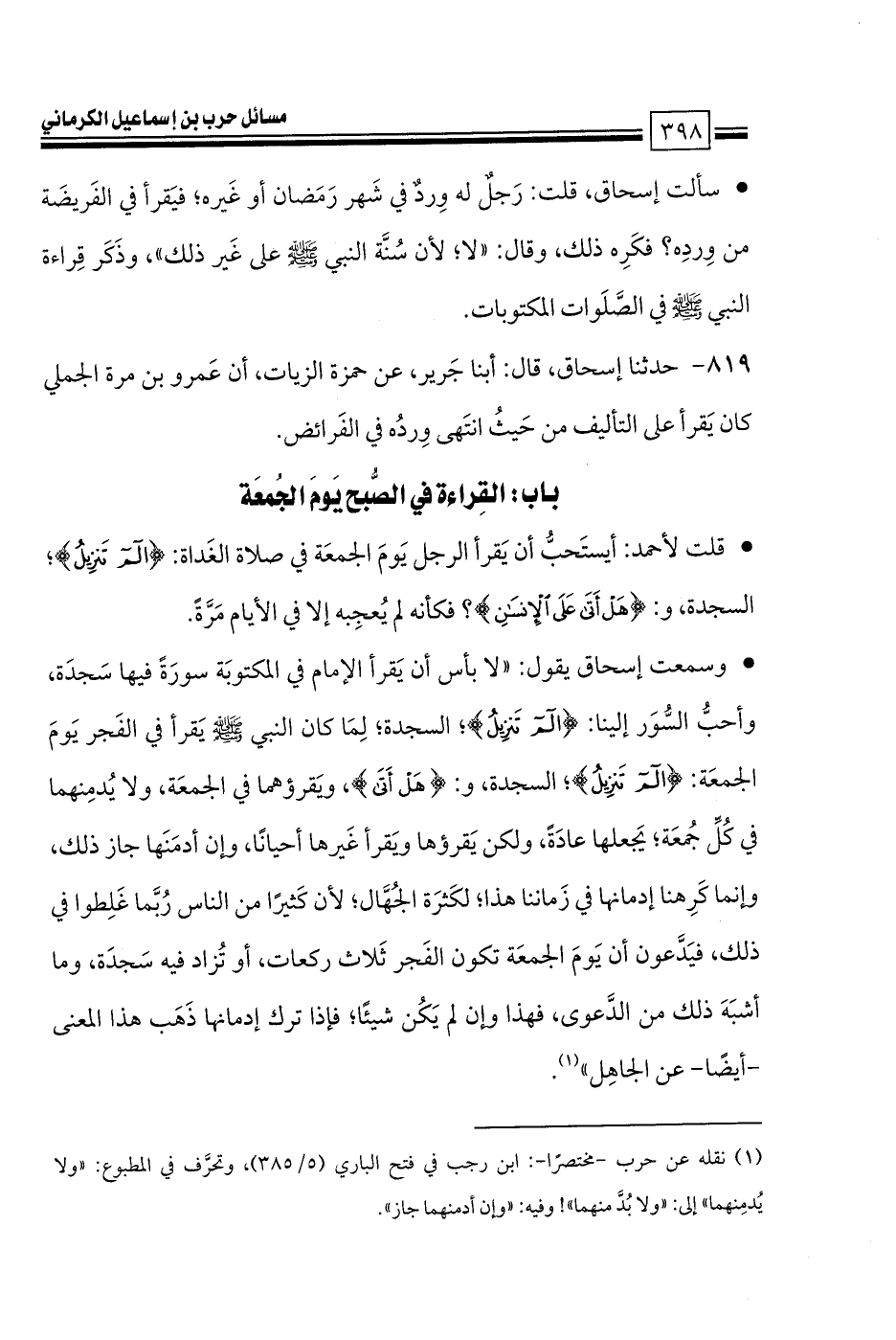 • وسمعت إسحاق يقول: «لا بأس أن يَقرأ الإمام في المكتوبَة سورَةً فيها سَجدَة، وأحبُّ السُّوَر إلينا: {الم تنزيل}؛ السجدة؛ لِمَا كان النبي صلى الله عليه وسلم يَقرأ في الفَجر يَومَ الجمعَة: {الم تنزيل}؛ السجدة، و: {هل أتى}، ويَقرؤهما في الجمعَة، ولا يُدمِنهما في كُلِّ جُمعَة؛ يَجعلها عادَةً، ولكن يَقرؤها ويَقرأ غَيرها أحيانًا، وإن أدمَنَها جاز ذلك، وإنما كَرِهنا إدمانها في زَماننا هذا؛ لكَثرَة الجُهَّال؛ لأن كَثيرًا من الناس رُبَّما غَلِطوا في ذلك، فيَدَّعون أن يَومَ الجمعَة تكون الفَجر ثَلاث ركعات، أو تُزاد فيه سَجدَة، وما أشبَهَ ذلك من الدَّعوى، فهذا وإن لم يَكُن شيئًا؛ فإذا ترك إدمانها ذَهَب هذا المعنى -أيضًا- عن الجاهِل».