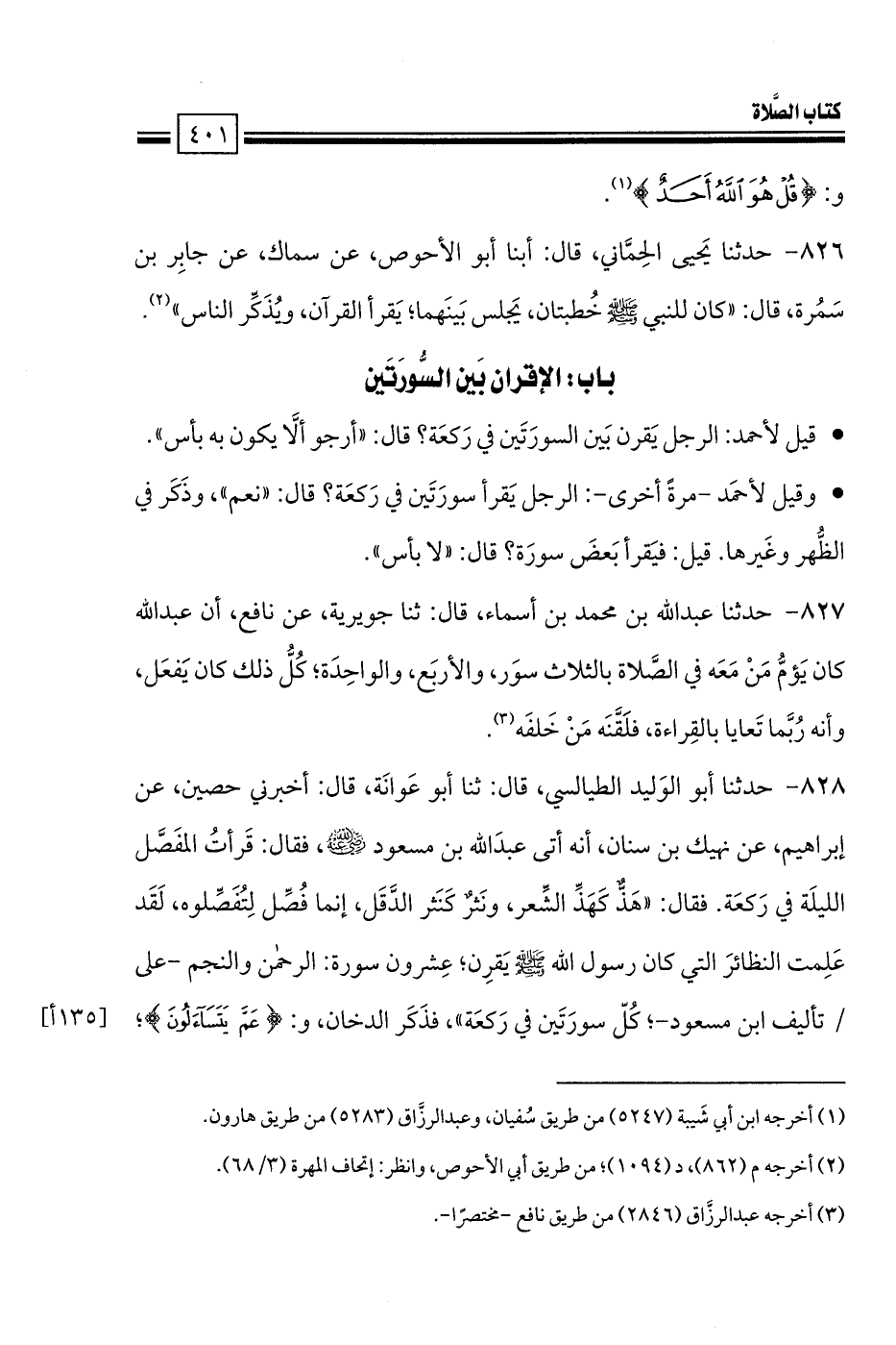 • قيل لأحمد: الرجل يَقرن بَين السورَتَين في رَكعَة؟ قال: «أرجو ألَّا يكون به بأس».