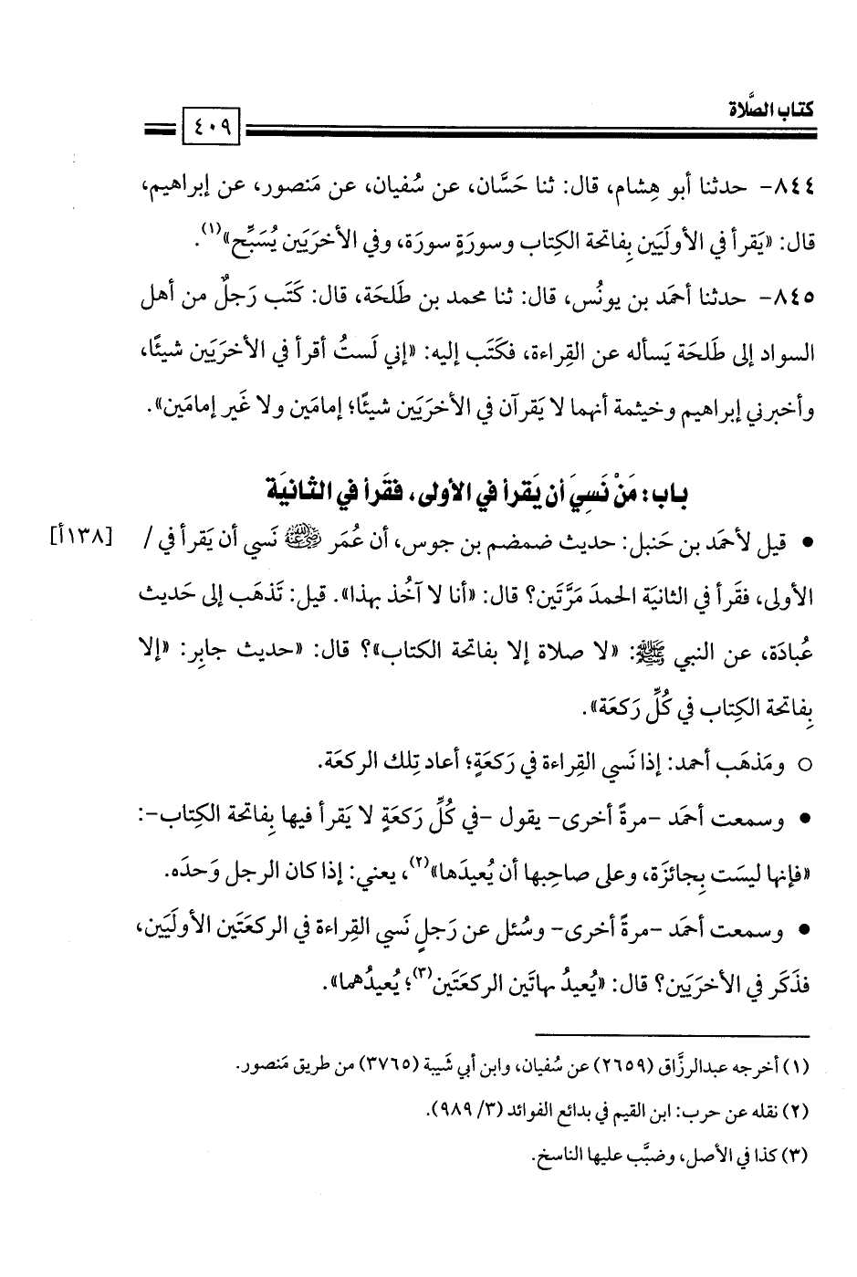 • وسمعت أحمَد -مرةً أخرى- وسُئل عن رَجلٍ نَسي القِراءة في الركعَتَين الأولَيَين، فذَكَر في الأخرَيَين؟ قال: «يُعيدُ بهاتَين الركعَتَين؛ يُعيدُهما».