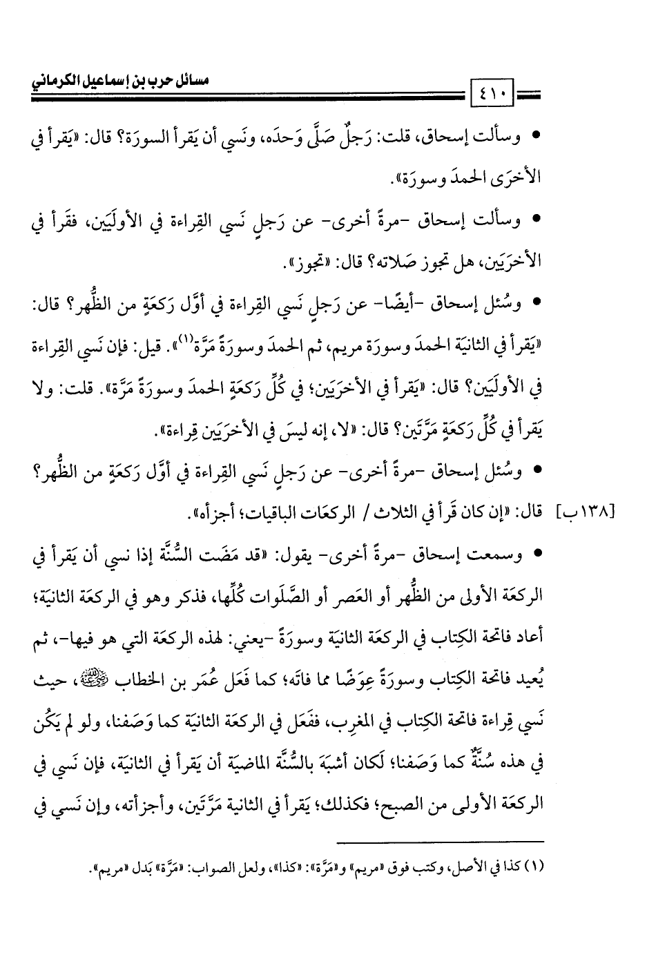 • وسألت إسحاق -مرةً أخرى- عن رَجلٍ نَسي القِراءة في الأولَيَين، فقَرأ في الأخرَيَين، هل تجوز صَلاته؟ قال: «تجوز».