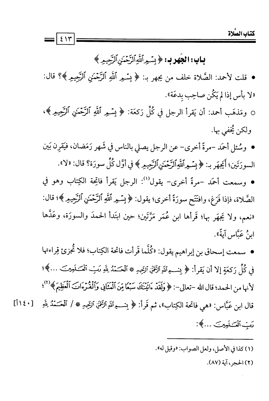 • قلت لأحمد: الصَّلاة خلف من يجهر بـ: {بسم الله الرحمن الرحيم}؟ قال: «لا بأس إذا لم يَكُن صاحِب بِدعَة».