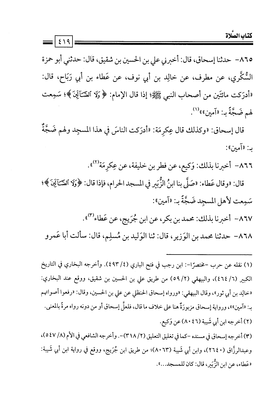 865 - حدثنا إسحاق، قال: أخبرني علي بن الحسين بن شقيق، قال: حدثني أبو حمزة السُّكَّري، عن مطرف، عن خالِد بن أبي نوف، عن عَطاء بن أبي رَبَاح، قال: «أدرَكت مائتَين من أصحاب النبي صلى الله عليه وسلم؛ إذا قال الإمام: {ولا الضالين}؛ سَمِعت لهم ضَجَّةً بـ: «آمين»».