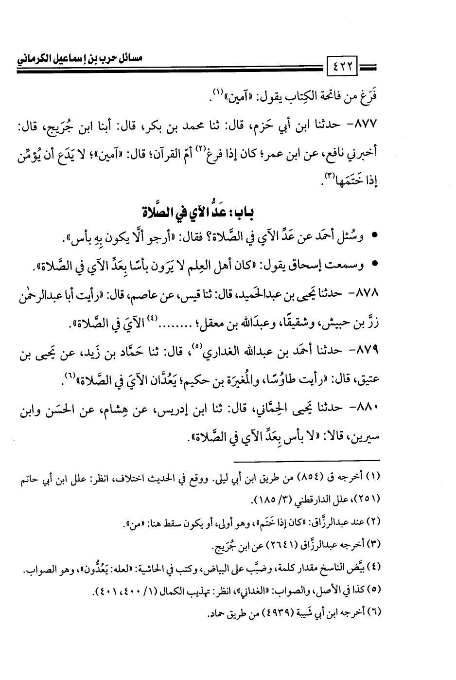 • وسمعت إسحاق يقول: «كان أهل العِلم لا يَرَون بأسًا بِعَدِّ الآي في الصَّلاة».