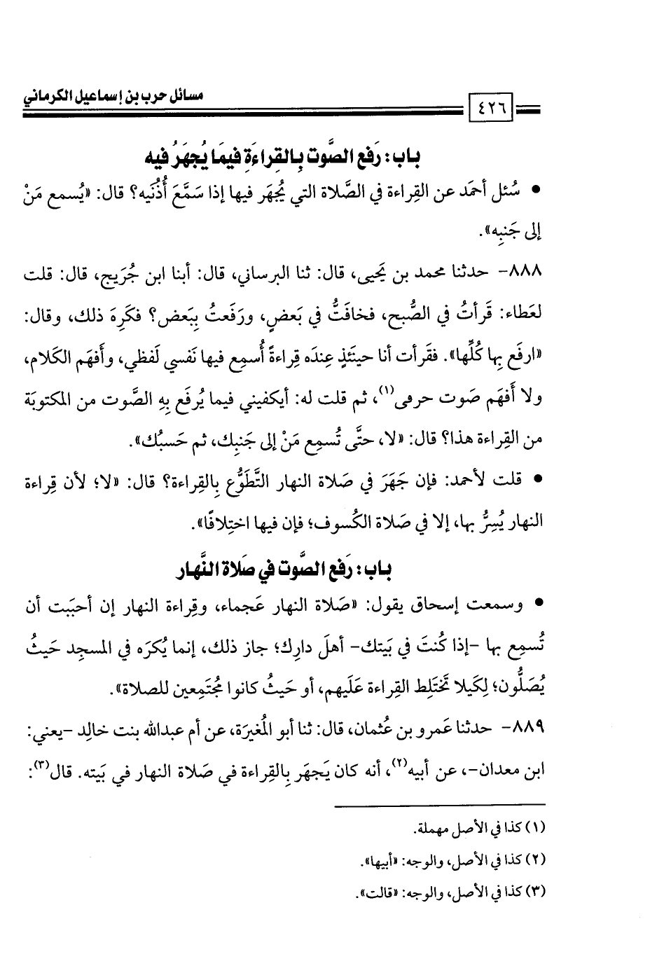 • وسمعت إسحاق يقول: «صَلاة النهار عَجماء، وقِراءة النهار إن أحبَبت أن تُسمِع بها -إذا كُنتَ في بَيتك- أهلَ دارِك؛ جاز ذلك، إنما يُكرَه في المسجِد حَيثُ يُصَلُّون؛ لِكَيلا تَختَلِط القِراءة عَلَيهم، أو حَيثُ كانوا مُجتَمِعين للصلاة».