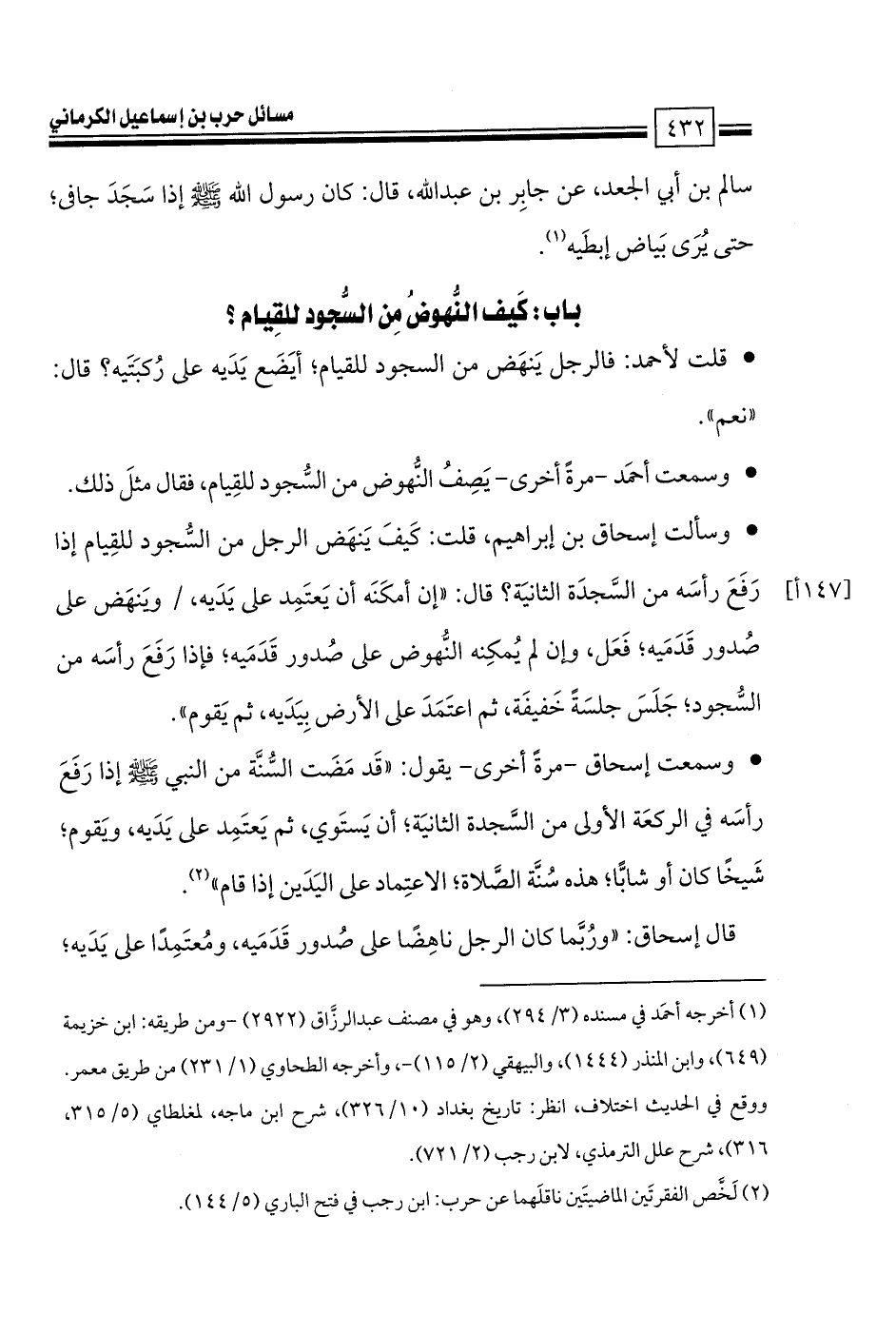 • وسألت إسحاق بن إبراهيم، قلت: كَيفَ يَنهَض الرجل من السُّجود للقِيام إذا رَفَعَ رأسَه من السَّجدَة الثانيَة؟ قال: «إن أمكَنَه أن يَعتَمِد على يَدَيه، ويَنهَض على صُدور قَدَمَيه؛ فَعَل، وإن لم يُمكِنه النُّهوض على صُدور قَدَمَيه؛ فإذا رَفَعَ رأسَه من السُّجود؛ جَلَسَ جلسَةً خَفيفَة، ثم اعتَمَدَ على الأرض بِيَدَيه، ثم يَقوم».
