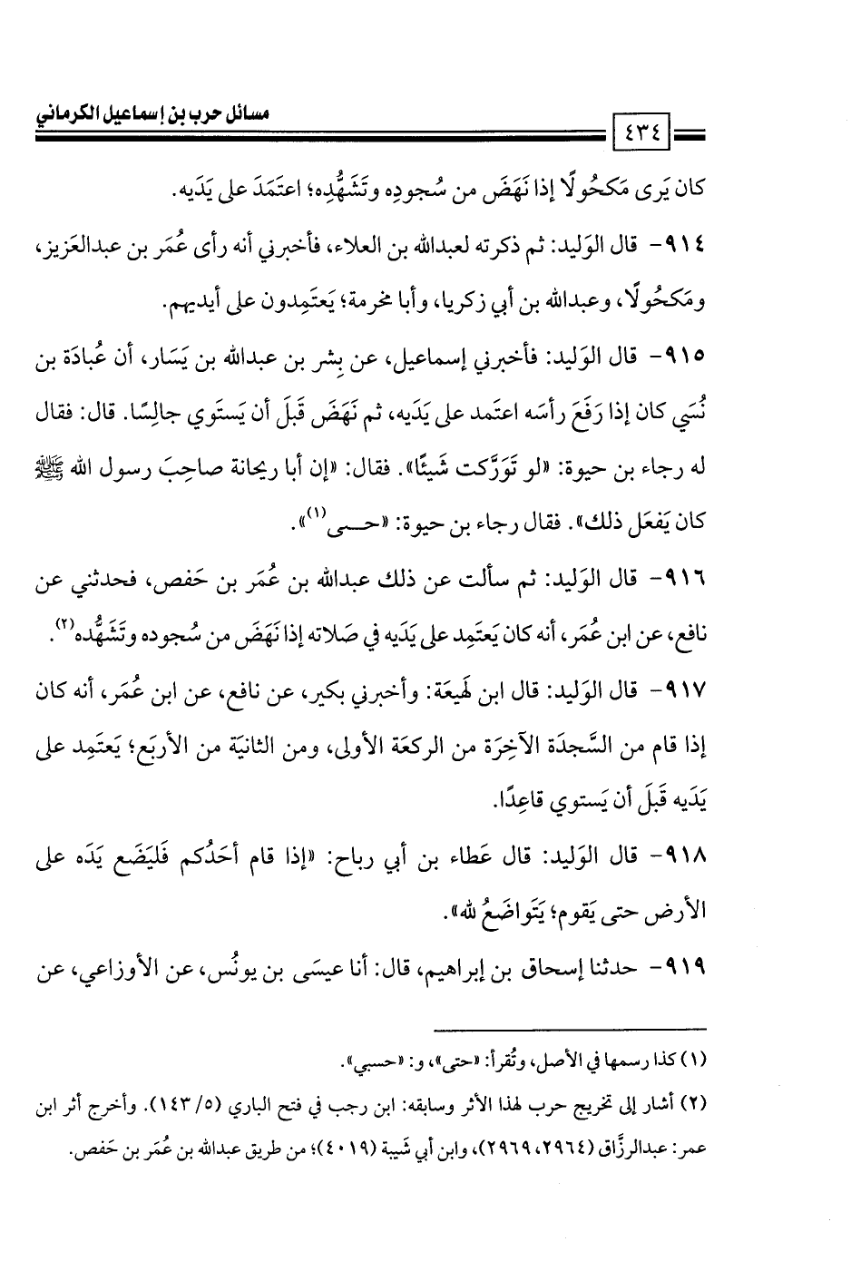 915 - قال الوَليد: فأخبرني إسماعيل، عن بِشر بن عبد الله بن يَسَار، أن عُبادَة بن نُسَي كان إذا رَفَعَ رأسَه اعتَمد على يَدَيه، ثم نَهَضَ قَبلَ أن يَستَوي جالِسًا. قال: فقال له رجاء بن حيوة: «لو تَوَرَّكت شَيئًا». فقال: «إن أبا ريحانة صاحِبَ رسول الله صلى الله عليه وسلم كان يَفعَل ذلك». فقال رجاء بن حيوة: «حىى (1)».