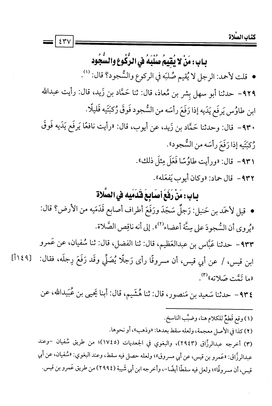 933 - حدثنا عَبَّاس بن عبد العَظيم، قال: ثنا الفضل، قال: ثنا سُفيان، عن عَمرو بن قيس، عن أبي قيس، أن مسروقًا رأى رَجلًا يُصَلِّي وقَد رَفَعَ رِجلَه، فقال: «ما تَمَّت صَلاته».