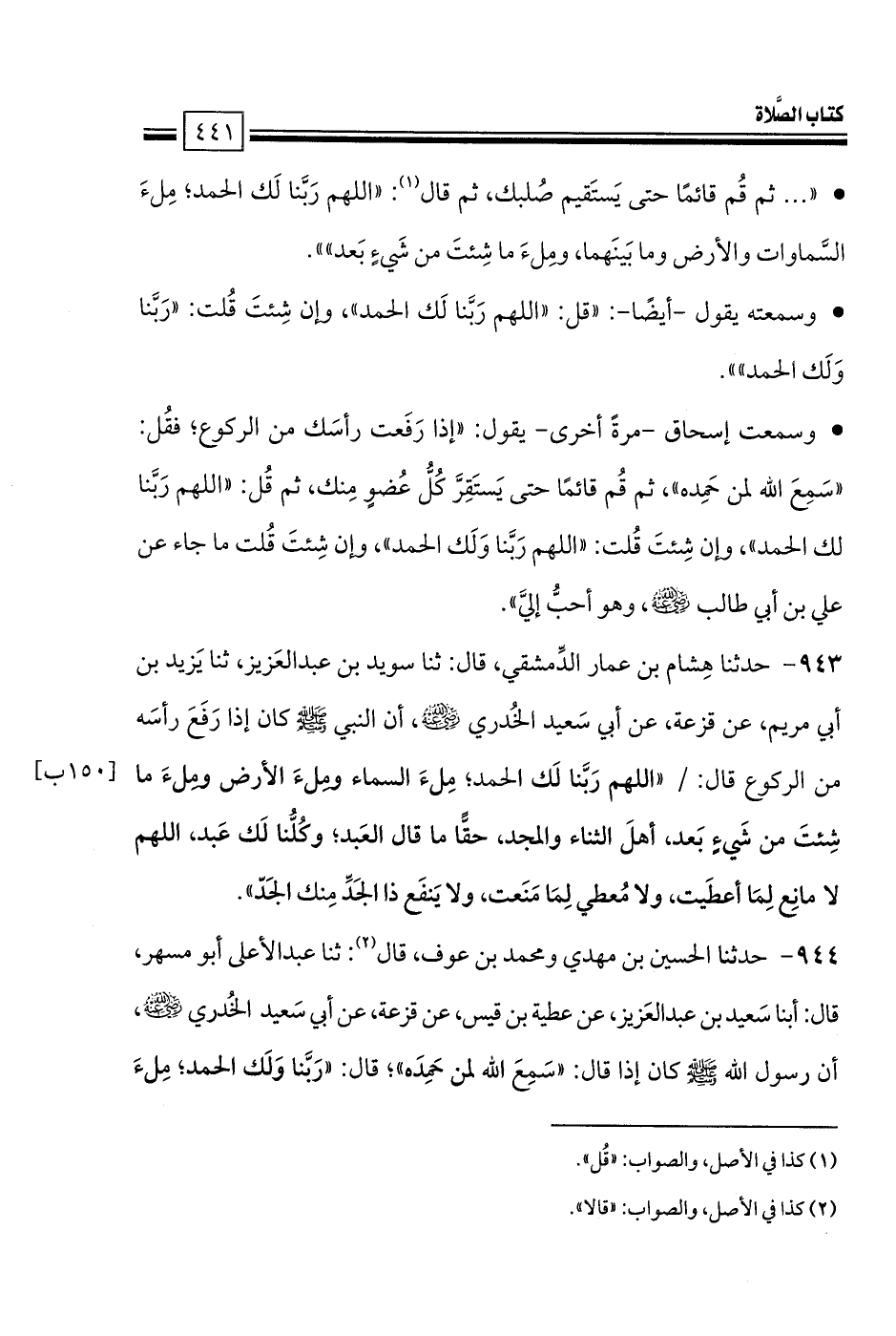 944 - حدثنا الحسين بن مهدي ومحمد بن عوف، قال (2): ثنا عبد الأعلى أبو مسهر، قال: أبنا سَعيد بن عبد العَزيز، عن عطية بن قيس، عن قزعة، عن أبي سَعيد الخُدري -رضي الله عنه-، أن رسول الله صلى الله عليه وسلم كان إذا قال: «سَمِعَ الله لمن حَمِدَه»؛ قال: «رَبَّنا وَلَك الحمد؛ مِلءَ -[442]- السماوات ومِلءَ الأرض ومِلءَ ما شِئتَ من شَيءٍ بَعد، أهلَ الثناء والمجد، أحَقُّ ما قال العَبد؛ كُلُّنا لَك عَبد، لا مانِع لِمَا أعطَيت، ولا مُعطي لِمَا مَنَعت، ولا يَنفَع ذا الجَدِّ منك الجَدّ».
