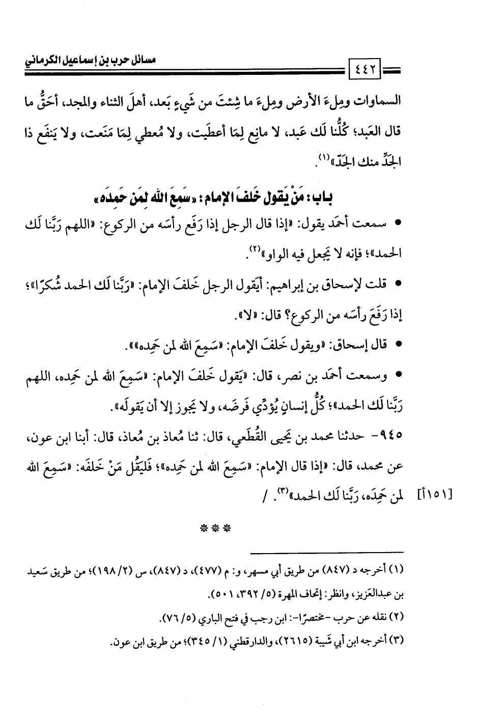 • وسمعت أحمَد بن نصر، قال: «يَقول خَلفَ الإمام: «سَمِعَ الله لمن حَمِده، اللهم رَبَّنا لَك الحمد»؛ كُلُّ إنسانٍ يُؤدِّي فَرضَه، ولا يَجوز إلا أن يَقولَه».