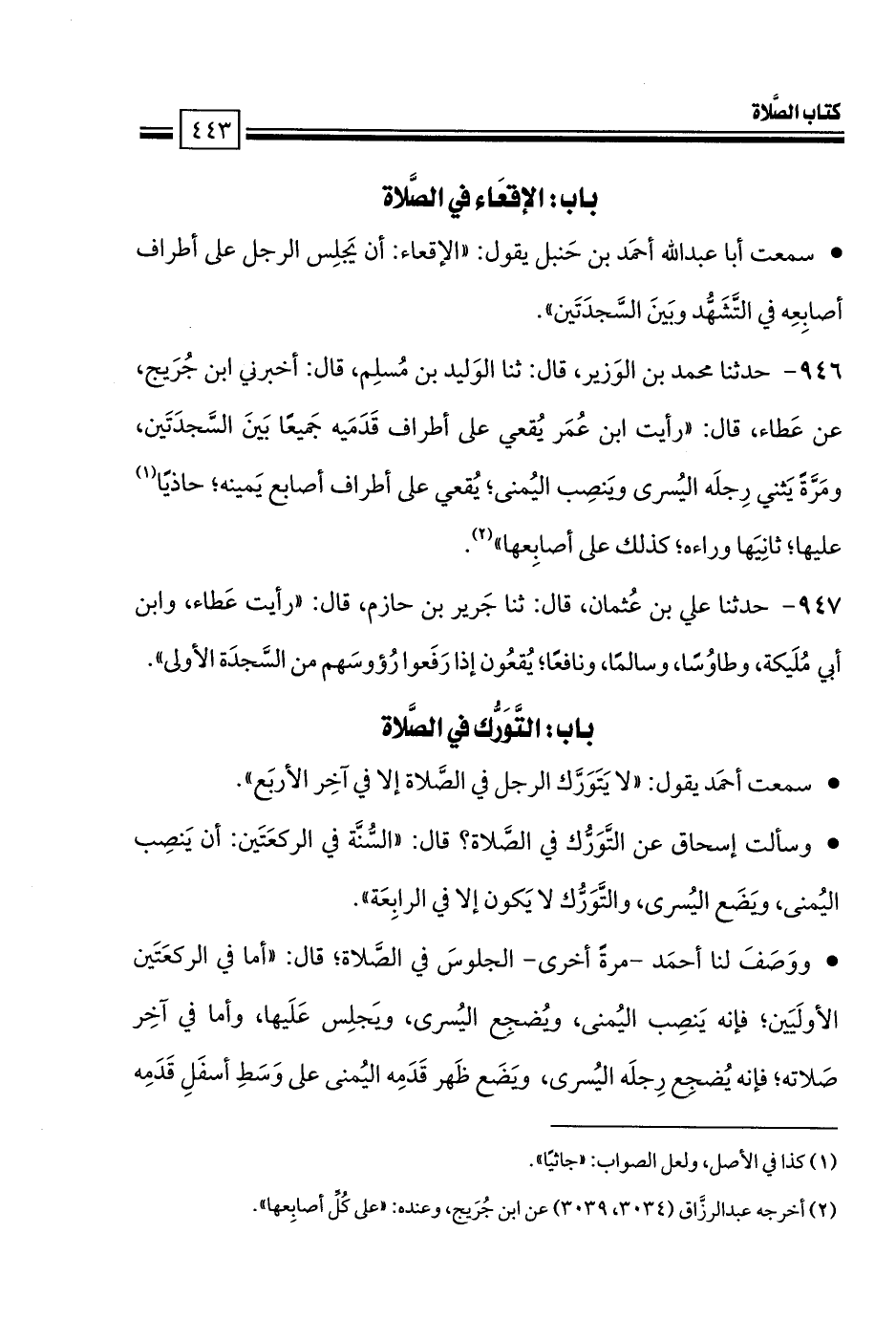 946 - حدثنا محمد بن الوَزير، قال: ثنا الوَليد بن مُسلِم، قال: أخبرني ابن جُرَيج، عن عَطاء، قال: «رأيت ابن عُمَر يُقعي على أطراف قَدَمَيه جَميعًا بَينَ السَّجدَتَين، ومَرَّةً يَثني رِجلَه اليُسرى ويَنصِب اليُمنى؛ يُقعي على أطراف أصابع يَمينه؛ حاذيًا (1) عليها؛ ثانِيَها وراءه؛ كذلك على أصابِعها».
