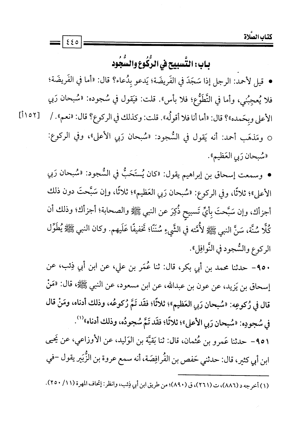 • وسمعت إسحاق بن إبراهيم يقول: «كان يُستَحَبُّ في السُّجود: «سُبحان رَبي الأعلى»؛ ثلاثًا، وفي الركوع: «سُبحان رَبي العَظيم»؛ ثلاثًا، وإن سَبَّحتَ دون ذلك أجزأك، وإن سَبَّحتَ بِأيِّ تَسبيحٍ ذُكِرَ عن النبي صلى الله عليه وسلم والصحابة؛ أجزأك؛ وذلك أن كُلًّا سُنَّة، سَنَّ النبي صلى الله عليه وسلم لأُمَّته في الشَّيءِ سُنَنًا؛ تَخفيفًا عَلَيهم. وكان النبي صلى الله عليه وسلم يُطَوِّل الركوع والسُّجود في النَّوافِل».