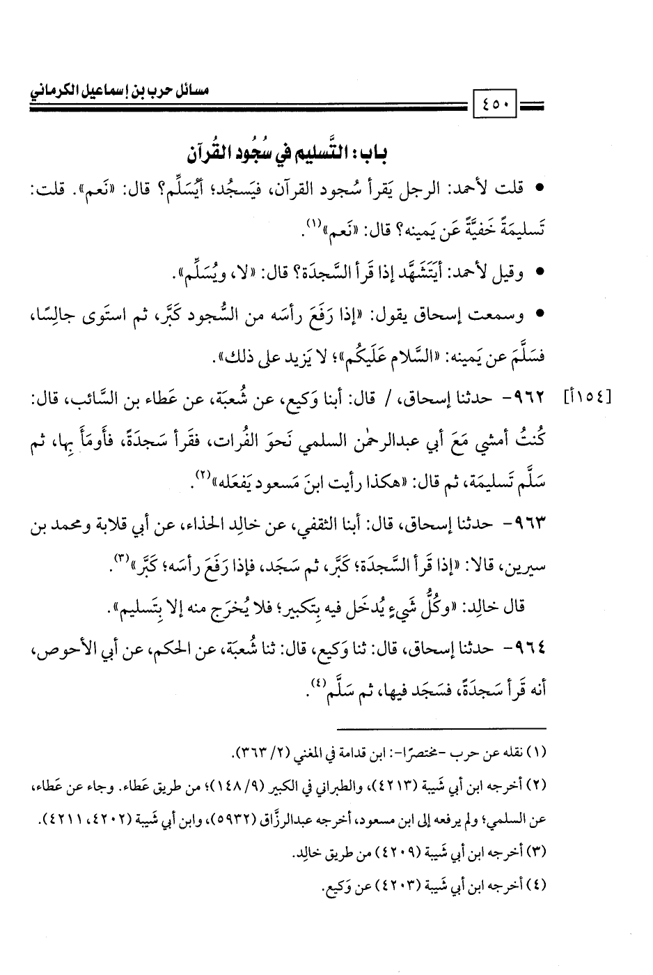 • قلت لأحمد: الرجل يَقرأ سُجود القرآن، فيَسجُد؛ أيُسَلِّم؟ قال: «نَعم». قلت: تَسليمَةً خَفيَّةً عَن يَمينه؟ قال: «نَعم».