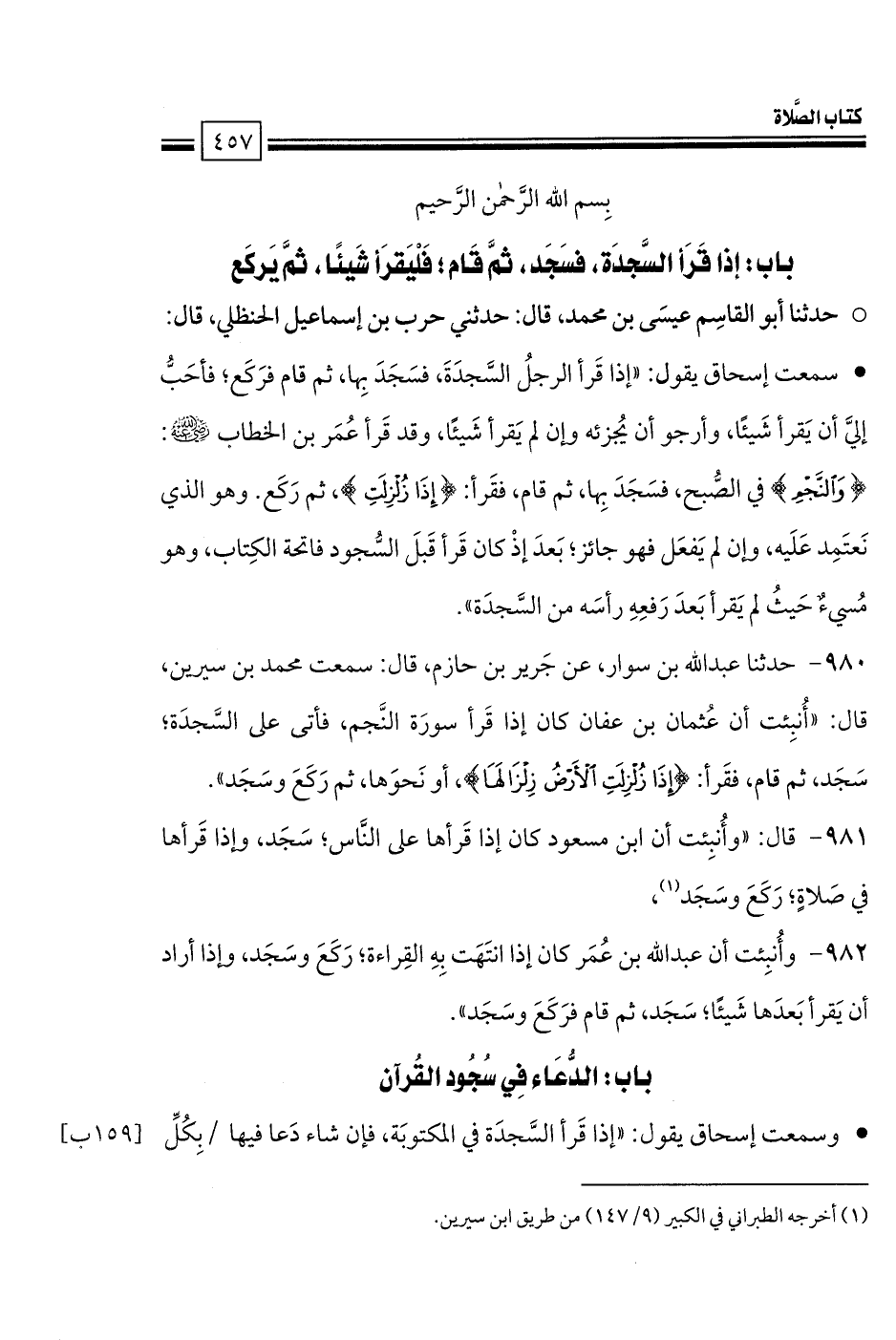 • سمعت إسحاق يقول: «إذا قَرأ الرجلُ السَّجدَةَ، فسَجَدَ بِها، ثم قام فرَكَع؛ فأحَبُّ إليَّ أن يَقرأ شَيئًا، وأرجو أن يُجزئه وإن لم يَقرأ شَيئًا، وقد قَرأ عُمَر بن الخطاب -رضي الله عنه-: {والنجم} في الصُّبح، فسَجَدَ بِها، ثم قام، فقَرأ: {إذا زلزلت}، ثم رَكَع. وهو الذي نَعتَمِد عَلَيه، وإن لم يَفعَل فهو جائز؛ بَعدَ إذْ كان قَرأ قَبلَ السُّجود فاتحة الكِتاب، وهو مُسيءٌ حَيثُ لم يَقرأ بَعدَ رَفعِهِ رأسَه من السَّجدَة».