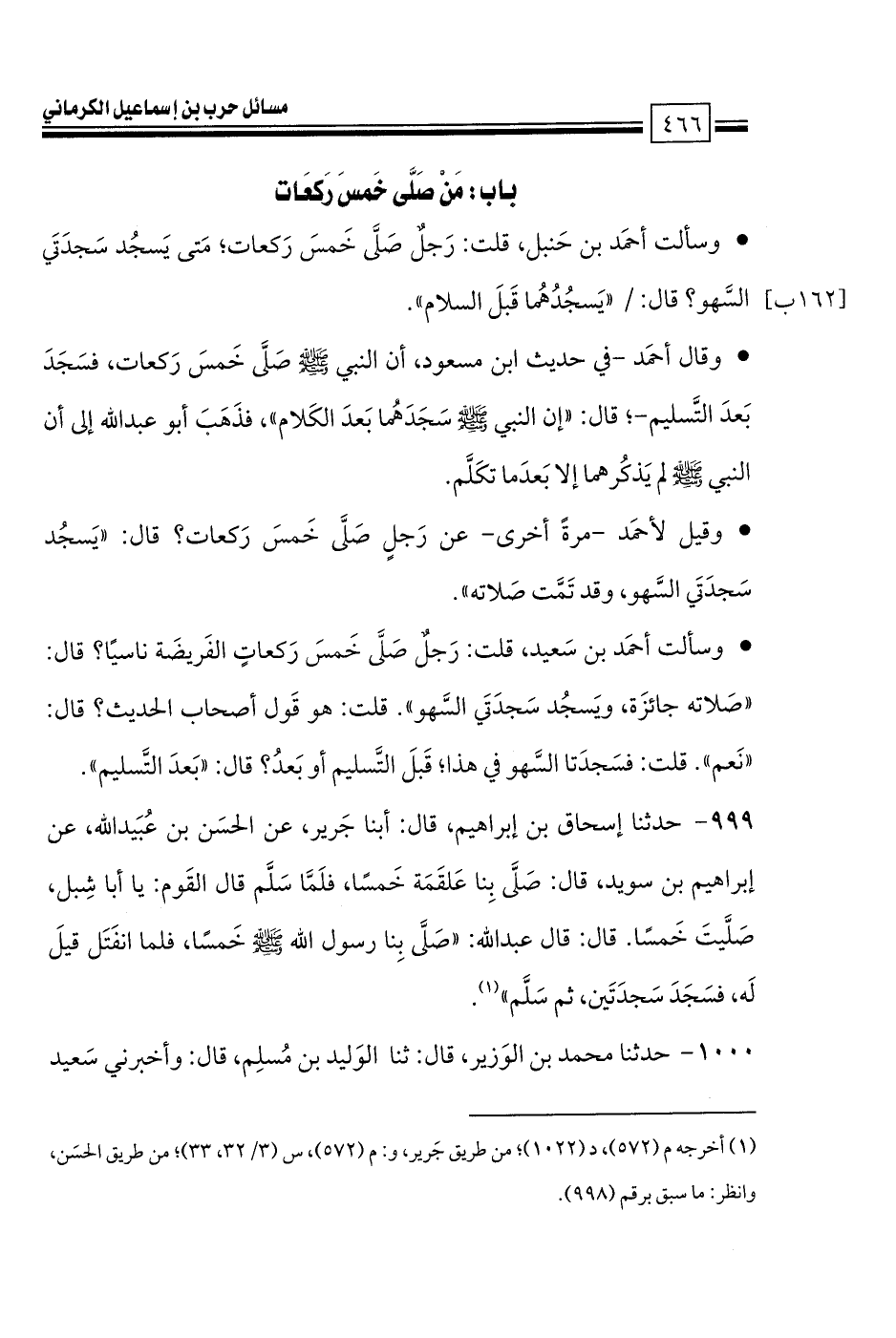• وسألت أحمَد بن سَعيد، قلت: رَجلٌ صَلَّى خَمسَ رَكعاتٍ الفَريضَة ناسيًا؟ قال: «صَلاته جائزَة، ويَسجُد سَجدَتَي السَّهو». قلت: هو قَول أصحاب الحديث؟ قال: «نَعم». قلت: فسَجدَتا السَّهو في هذا؛ قَبلَ التَّسليم أو بَعدُ؟ قال: «بَعدَ التَّسليم».