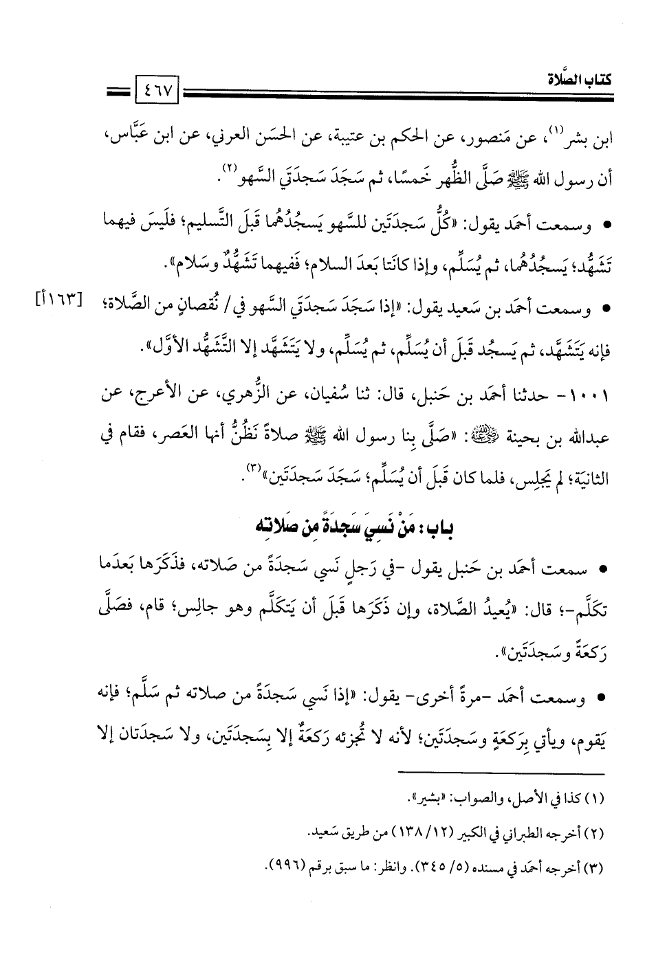 • وسمعت أحمَد يقول: «كُلُّ سَجدَتَين للسَّهو يَسجُدُهُما قَبلَ التَّسليم؛ فلَيسَ فيهما تَشَهُّد؛ يَسجُدُهُما، ثم يُسَلِّم، وإذا كانَتا بَعدَ السلام؛ فَفيهما تَشَهُّدٌ وسَلام».