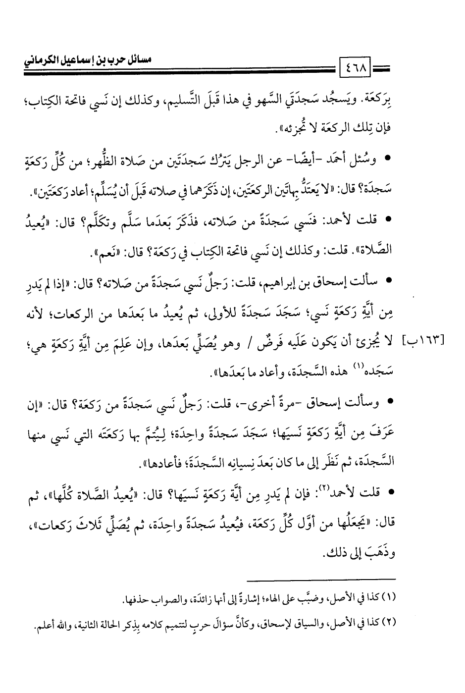 • قلت لأحمد: فنَسي سَجدَةً من صَلاته، فذَكَرَ بَعدَما سَلَّم وتكَلَّم؟ قال: «يُعيدُ الصَّلاة». قلت: وكذلك إن نَسي فاتحة الكِتاب في رَكعَة؟ قال: «نَعم».
