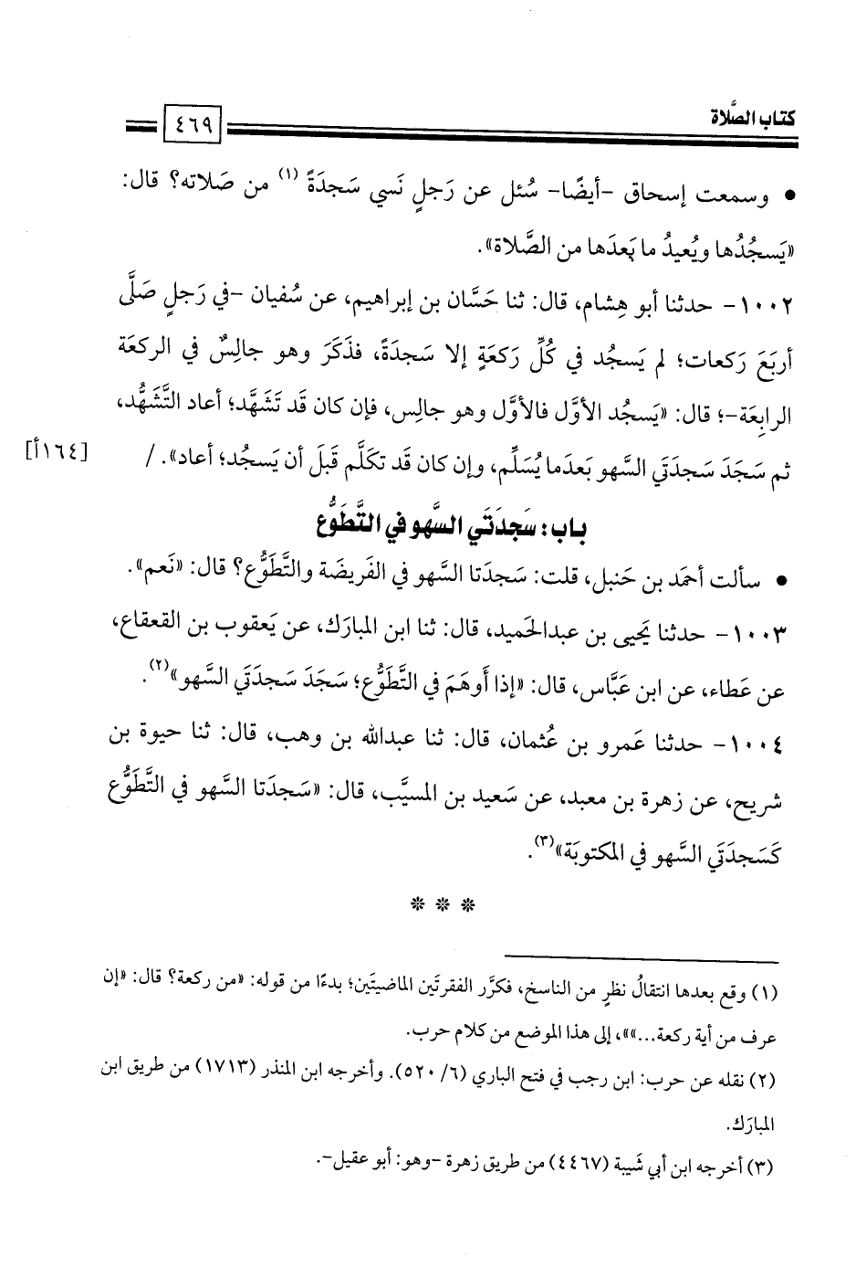 • سألت أحمَد بن حَنبل، قلت: سَجدَتا السَّهو في الفَريضَة والتَّطَوُّع؟ قال: «نَعم».