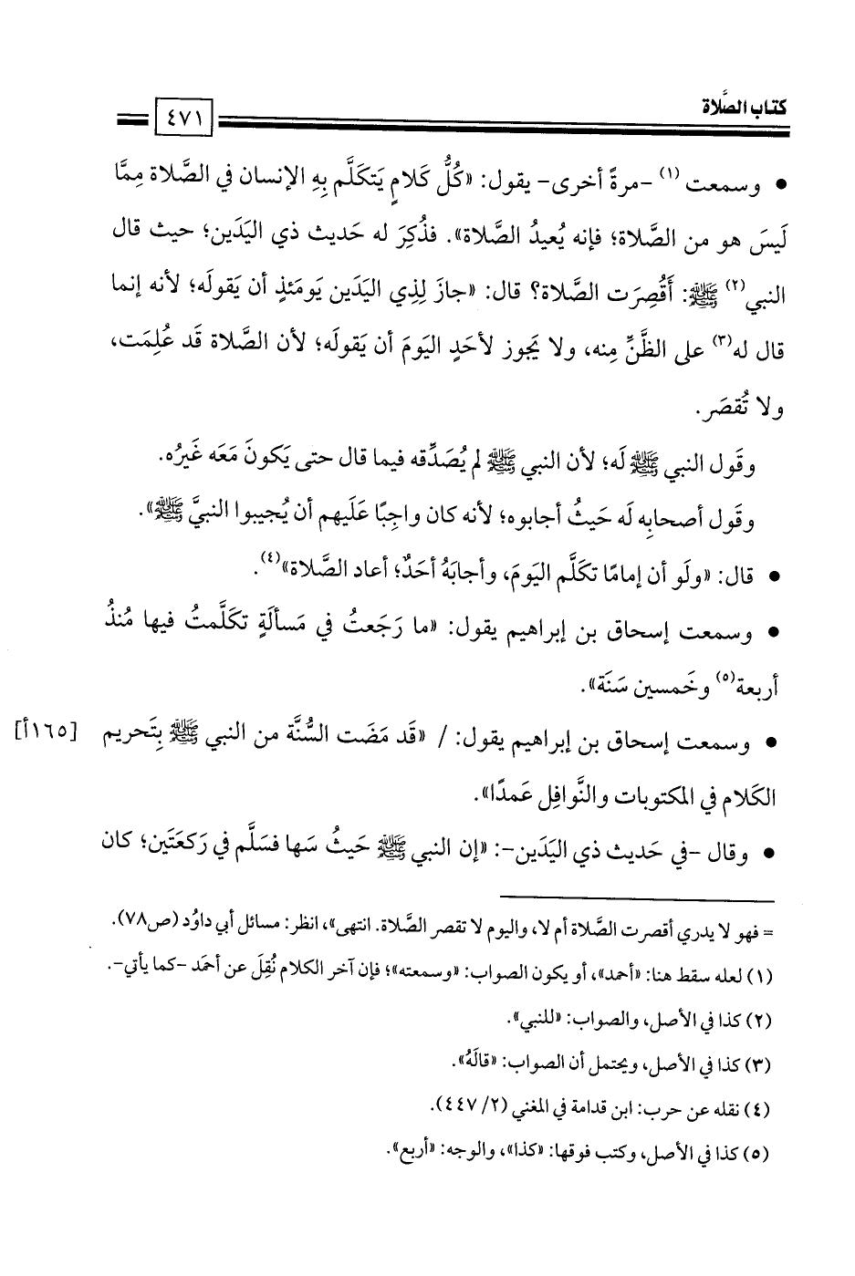 • وسمعت إسحاق بن إبراهيم يقول: «قَد مَضَت السُّنَّة من النبي صلى الله عليه وسلم بِتَحريم الكَلام في المكتوبات والنَّوافِل عَمدًا».
