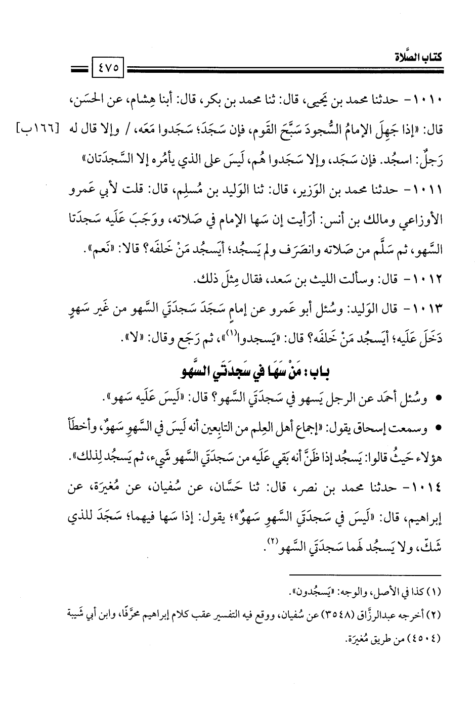 1013 - قال الوَليد: وسُئل أبو عَمرو عن إمامٍ سَجَدَ سَجدَتَي السَّهو من غَير سَهوٍ دَخَلَ عَلَيه؛ أيَسجُد مَنْ خَلفَه؟ قال: «يَسجدوا (1)»، ثم رَجَع وقال: «لا».