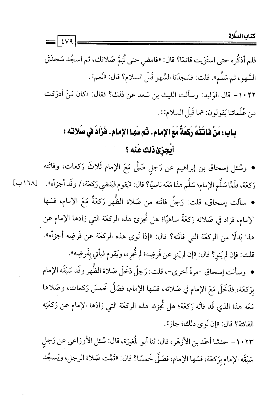 • سألت إسحاق، قلت: رَجلٌ فاتَته من صَلاة الظُّهر رَكعَةٌ مَعَ الإمام، فسَها الإمام، فزاد في صَلاته رَكعَةً ساهيًا؛ هل تُجزئ هذه الركعَة التي زادها الإمام عن هذا بَدلًا من الركعَة التي فاتَته؟ قال: «إذا نَوى هذه الركعَة عن فَرضِه أجزأه». قلت: فإن لم يَنوِ؟ قال: «إن لم يَنوِ عن فَرضِه؛ لم تُجزِه، ويَقوم فيأتي بِفَرضِه».