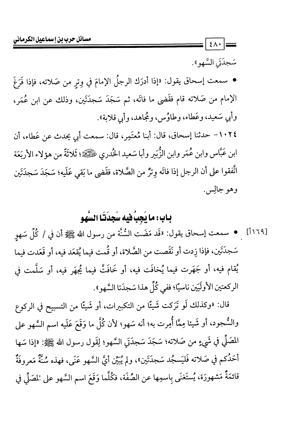 • سمعت إسحاق يقول: «قَد مَضَت السُّنَّة من رسول الله صلى الله عليه وسلم أن في كُلِّ سَهوٍ سَجدَتَين، فإذا زِدت أو نَقَصت من الصَّلاة، أو قُمت فيما يُقعَد فيه، أو قَعَدت فيما يُقام فيه، أو جَهَرت فيما يُخافَت فيه، أو خَافَتَّ فيما يُجهَر فيه، أو سَلَّمت في الركعتين الأولَيَين ناسيًا؛ ففي كُلِّ هذا سَجدَتا السَّهو».